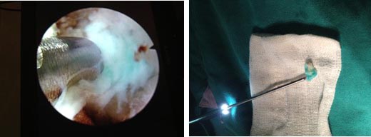 图一:镜下拔除突出的髓核 图二:拔出体外的突出髓核