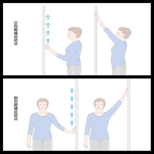 动作:面对或侧对墙壁,患侧手指沿墙缓缓向上爬,直到感到轻微牵拉感,维持10-15秒后慢慢放下。