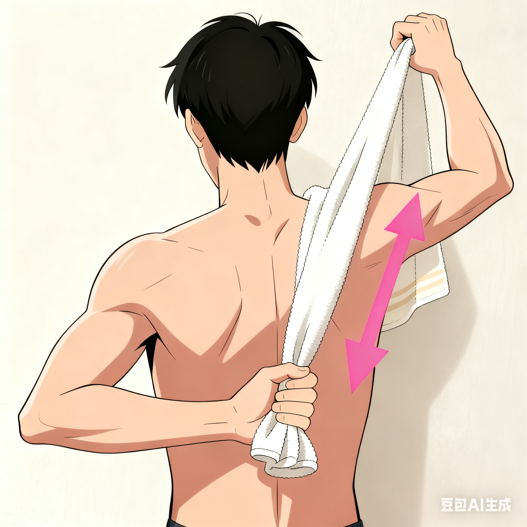 动作:健侧手臂在上,患侧手臂在下,于背后握住一条毛巾的两端。健侧手臂向上拉毛巾,从而带动患侧手臂向上移动。