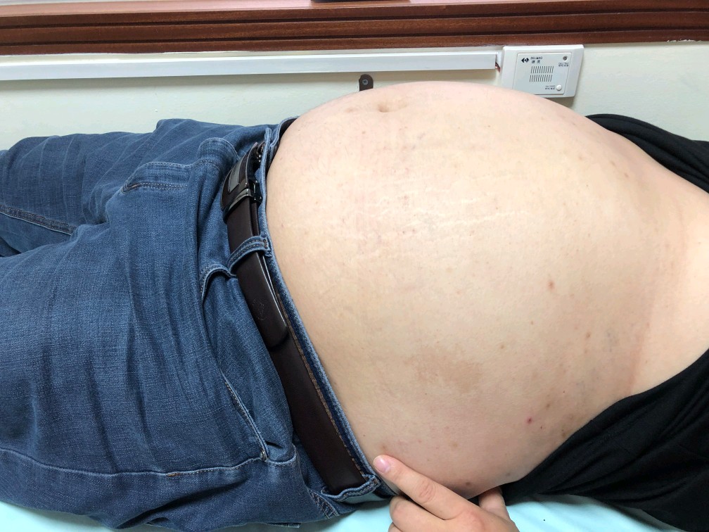 治疗前,140余斤,腹部向四周膨隆,弯腰下蹲翻身困难