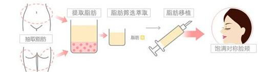 从人体自身腹部或大腿内侧等脂肪堆积较多的地方抽取一些脂肪,再将取出来的脂肪用离心机做离心分离处理后提取纯脂肪,然后注入到面部所需部位,达到饱满、童颜的效果。