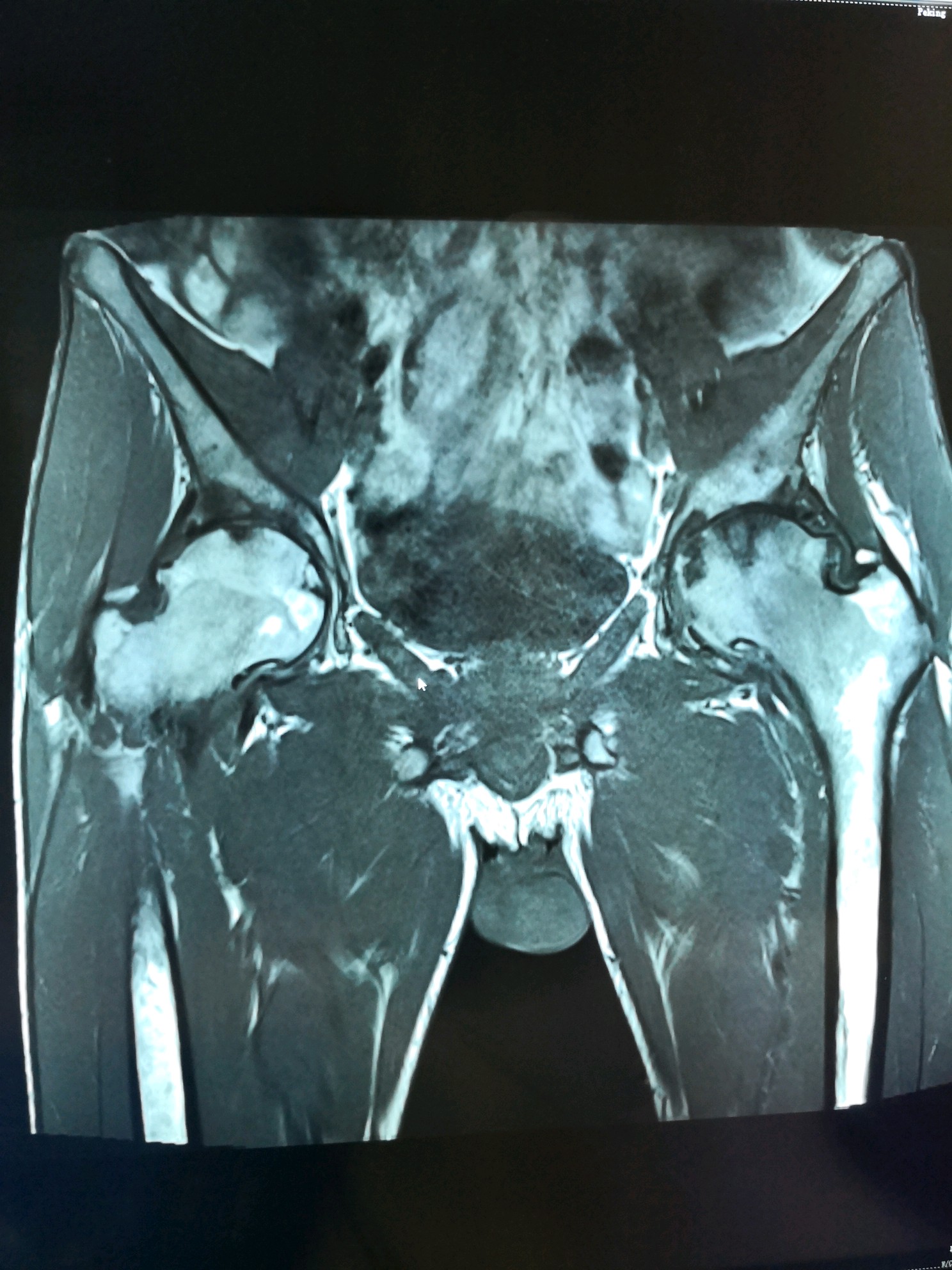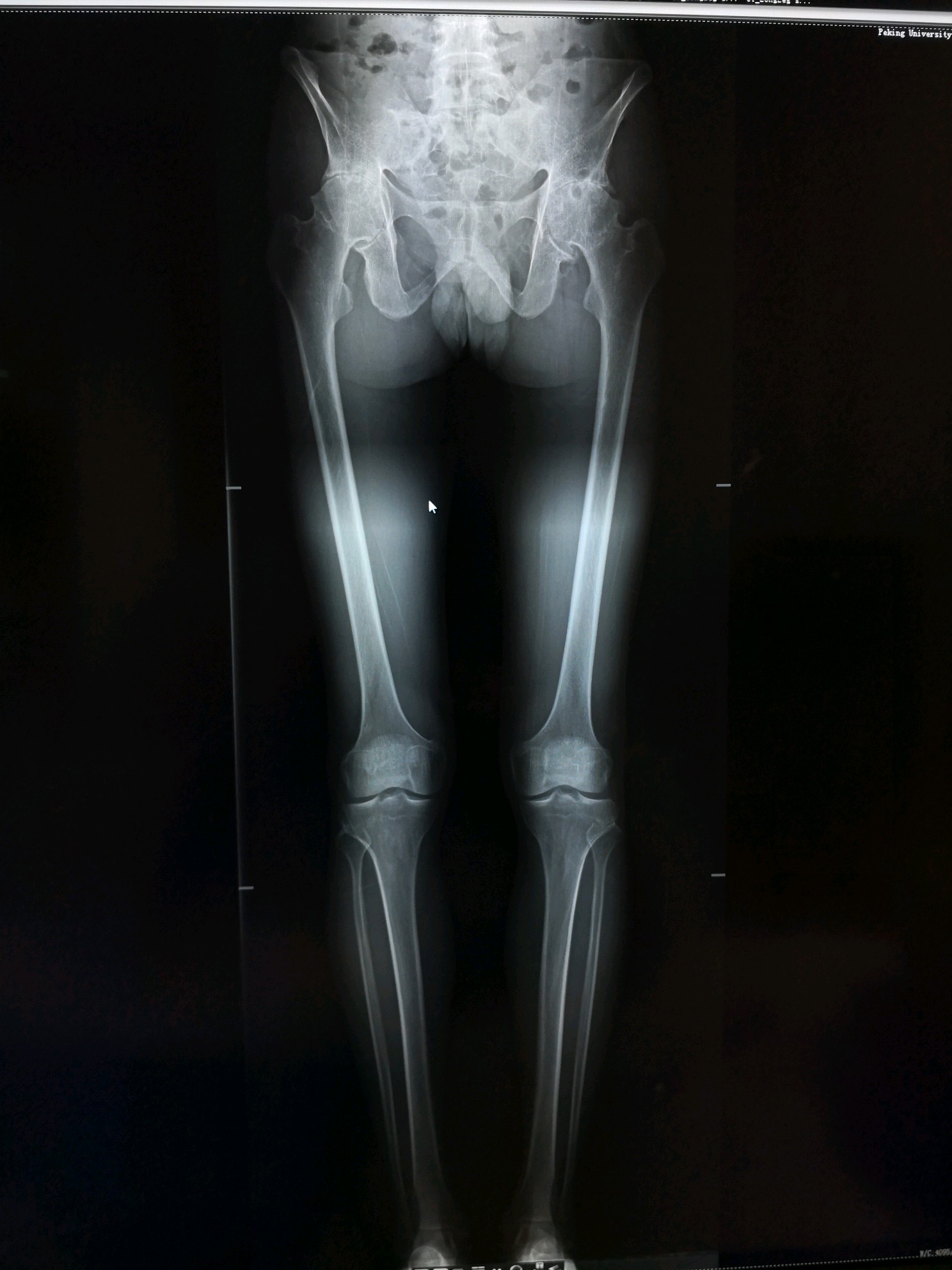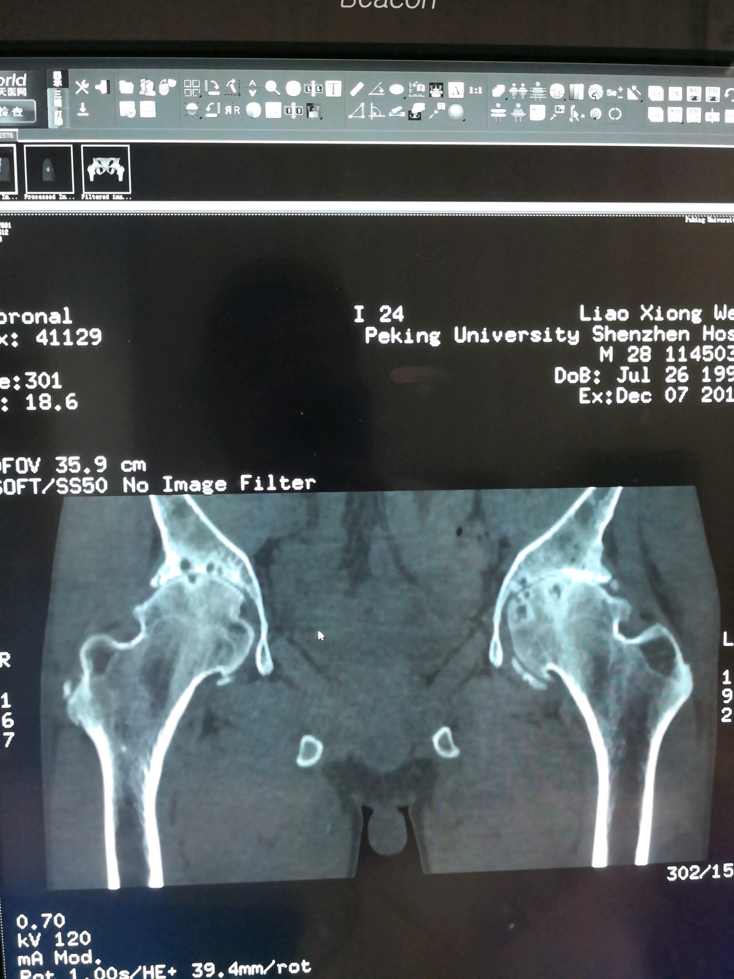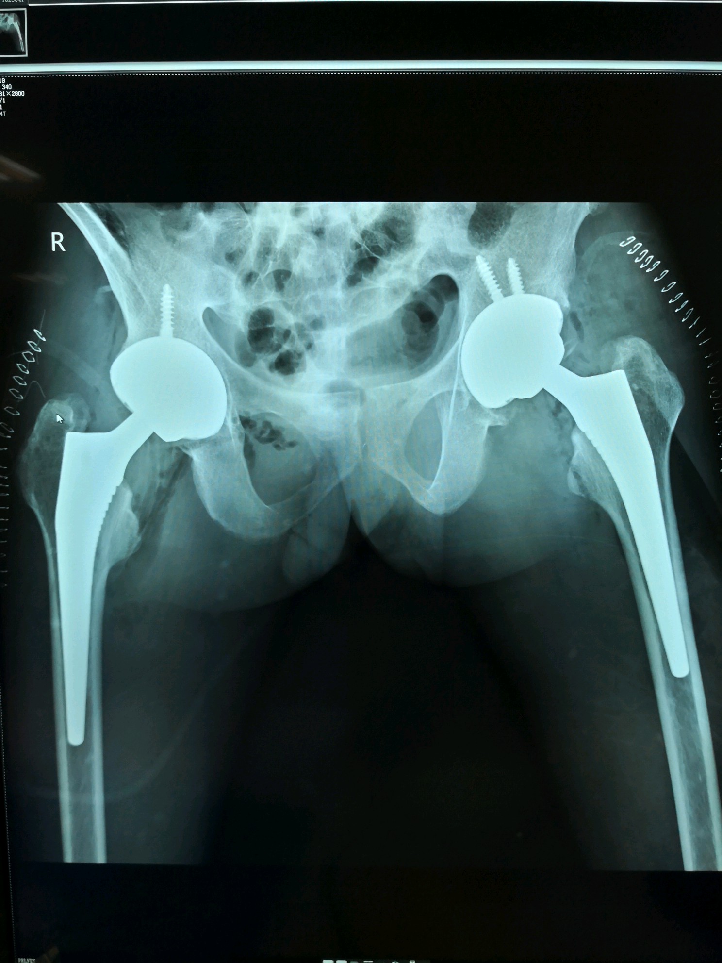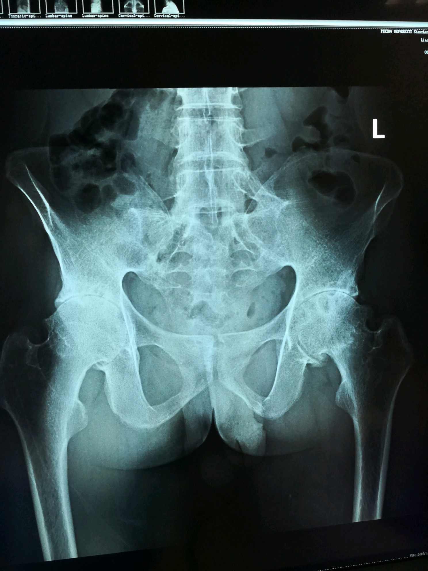 患者28岁男性,患强直性脊柱炎多年,现双髋部疼痛,行走时加重,双髋关节屈伸活动受限,双下肢不能外展。颈椎及腰椎活动尚好。为提高生活质量,可以从事日常工作及生活,住院手术治疗,一次性行双侧髋关节置换手术。采用进口陶对陶关节。术后恢复良好。