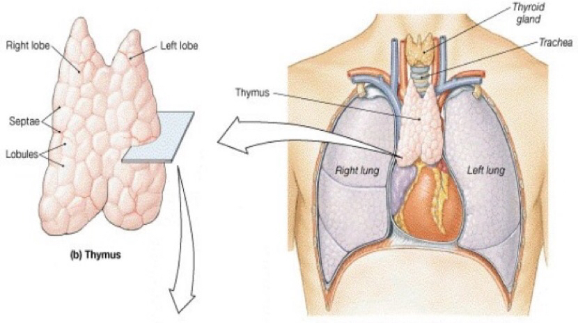 胸腺位于胸腔内前上纵隔,胸骨后心脏的上方,呈一只蝴蝶的形状。