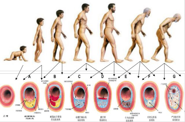 婴儿期我们的血管是非常光滑的,弹性非常好,几十年之后血管逐渐硬化。就像以前用的煤气橡胶管,新管的时候弹性非常好,但是风吹日晒之后,弹性慢慢减小,管壁逐渐变硬。