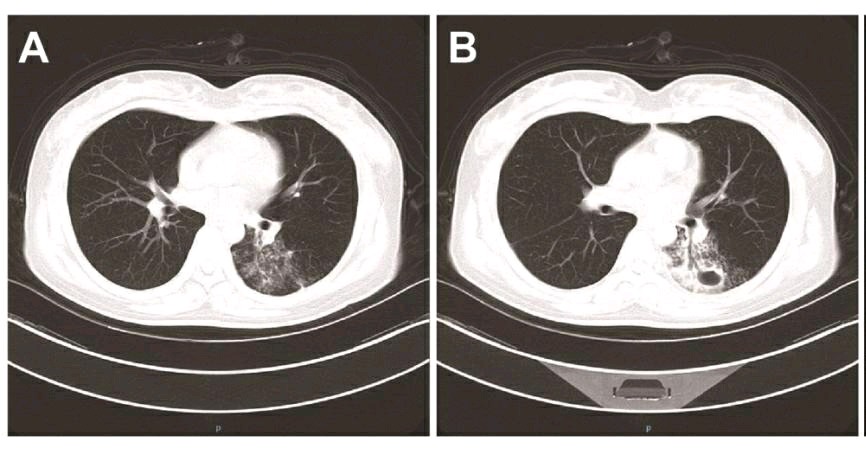 小宁胸部CT检查提示:左下肺实变并空洞,考虑感染或吸入性肺炎。结合血沉升高,小宁考虑是肺结核,排除新冠肺炎。