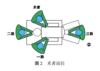 一般情况下,主刀医师位于患者左侧,一助位于患者右侧。二助位于患者头侧,操纵光学视管与摄像镜头;也可一助位于患者右侧,同时操纵腹腔镜镜头,根据人员多少灵活安排。三助位于患者两腿之间,操纵举宫装置。