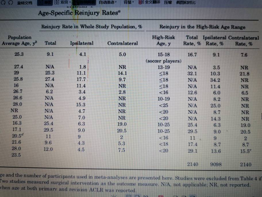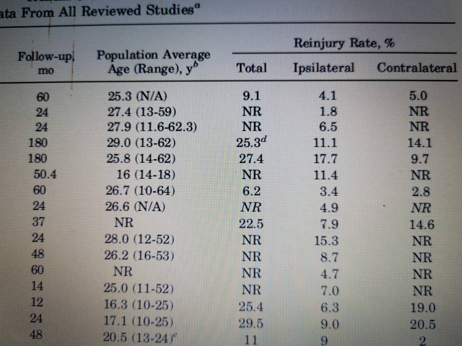 有权威的报道显示(它分析了1966-2015年的大量研究数据),总体上,ACL再损伤总发生率为15%,其中同侧再损伤发生率为7%,对侧损伤发生率为8%。小于25岁患者的继发ACL损伤率为21%,25岁以下重返赛场的运动员发生二级ACL损伤的几率为23%。