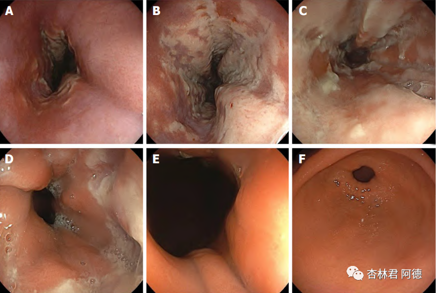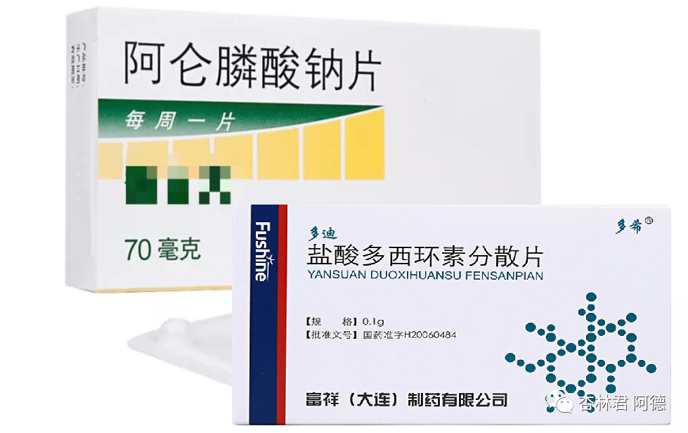 做出来的结果有点出乎意外,前后两个都是食管中段和下段大片的糜烂和浅溃疡,有点像化学品腐蚀到的,而第二个老人家食管还明显变窄了,像是长了肿瘤。再追问病史,才知道她俩都是吃药后才出现。一个吃了治疗骨质疏松症的阿仑膦酸钠片,一个则是吃了现在很少用的消炎药土霉素片,这两个药都有一定的腐蚀性,如果喝水少或者吃完马上就躺着,就容易粘在食管壁上腐蚀食管黏膜,导致药物性食管炎,这时吞东西就会痛,有时不吃东西也痛;而第二个老人家还有特殊情况,病理活检和胸部增强CT证实确实长肿瘤了,导致食管变窄了,药片就更容易卡在那里下不去,腐蚀导致的食管炎就更厉害。