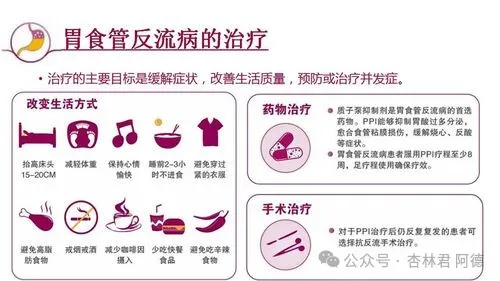 (1)改变生活方式:戒烟、戒酒、睡前2-3小时内不进食,平时吃饭时细嚼慢咽,避免饱食,避免进食诱发反流症状的食物(如咖啡、茶、碳酸饮料、高脂食物、甜食等)、睡觉时抬高床头或垫高枕头(约30°),肥胖或超重的要减肥,特别是控制腹围。有研究显示,体重指数增加和反流症状发生风险及症状严重程度呈正相关。大规模人群队列调查发现,减肥可明显减轻症状,提高药物治疗的成功率。吸烟与胃食管反流病发生密切相关,戒烟能减少正常体重患者的反流症状及反流次数。系统综述显示睡眠时抬高床头可明显缩短食管酸暴露时间,有效控制反流症状。