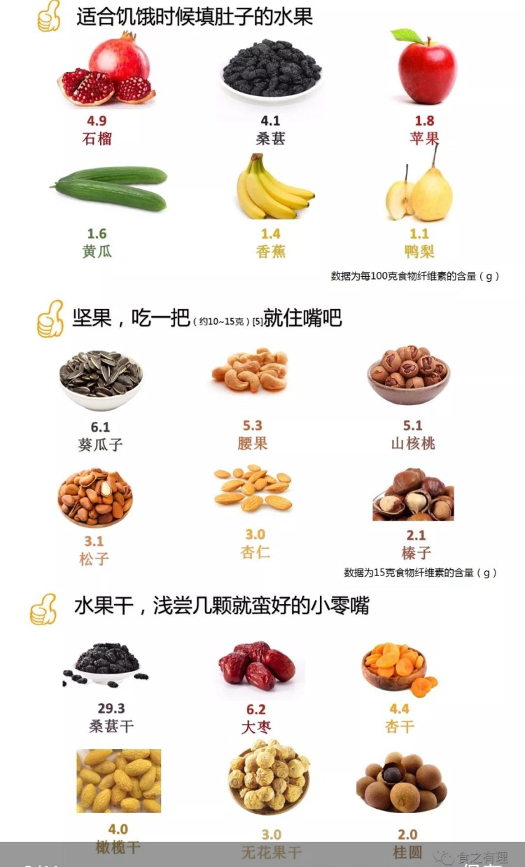 零食中纤维素含量越高,饱足感觉越强,减少下一餐进食量的效果越好,但像坚果和水果干这种纤维素虽高,能量和糖分也高的零食,适量才很美好。