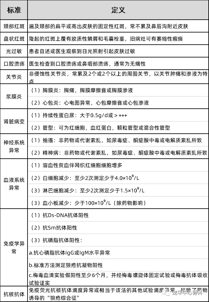 1997年美国风湿病协会(ACR)修订的SLE分类标准,11项症状、体征及实验室检查指标,符合其中4项或以上即可诊断: