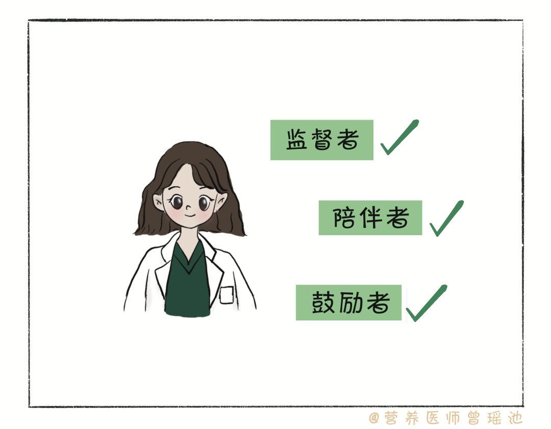 在患者生活方式改变的过程中,医生多大的参与度才是合格的“在位”?当营养医师这么多年,我觉得医生至少要在患者减肥路上承担监督者、陪伴者和鼓励者的角色。