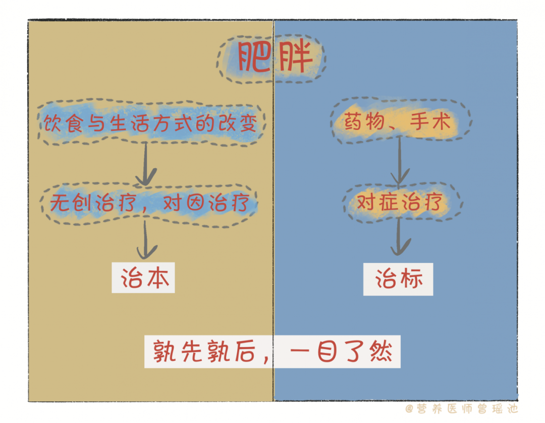 对肥胖,饮食与生活方式的改变,是无创治疗,是对因治疗,是治本;而药物、手术,则是对症治疗,是治标。孰先孰后,一目了然。