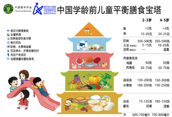 中国营养学会妇幼营养分会制定的《中国学龄前儿童平衡膳食宝塔》基本满足了该年龄段孩子的营养及能量需求,家长可参考宝塔上各类食物的推荐摄入量来给孩子准备每日餐饮。