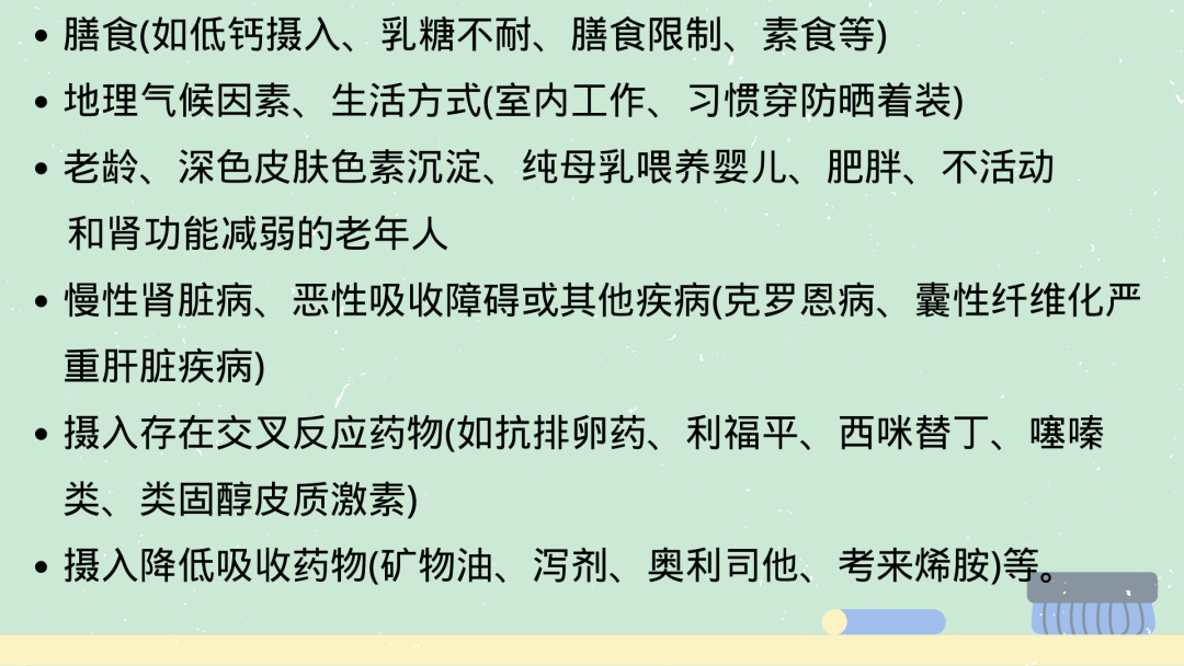 影响维生素D及其补充的因素包括遗传和非遗传因素。在观察性人群研究中,影响维生素D水平的因素包括: