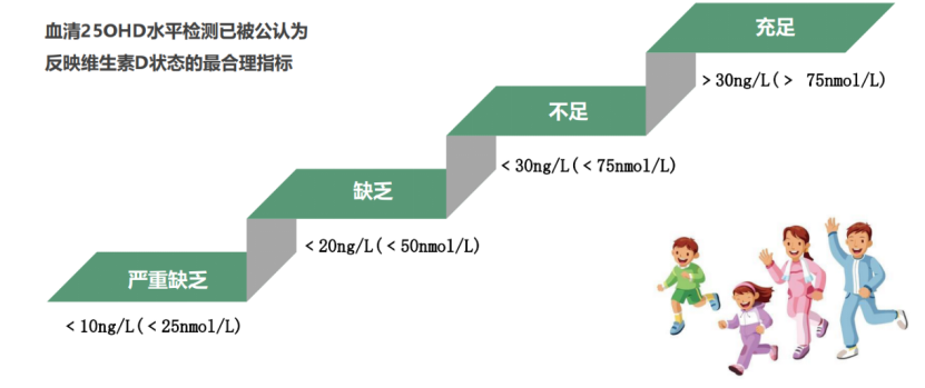 血清25OHD<20ng/ml(50nmol/L)为维生素D缺乏;
