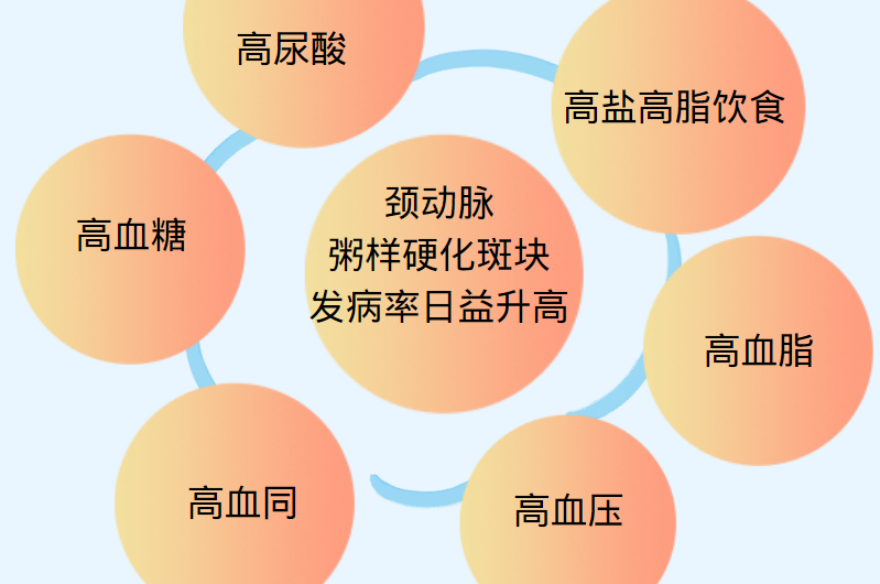 随着生活水平的提高及人口的老龄化、高盐高脂饮食,高血压、高血糖、高血脂、高尿酸及高同型半胱氨酸血症发病率上升,也导致颈动脉粥样硬化斑块发病率日益升高。随着人们健康意识的增强以及颈动脉超声检查等的广泛应用,颈动脉粥样硬化斑块的检出率越来越高,40~54岁健康人群约1/3可见血管粥样硬化性改变,而且呈年轻化趋势。