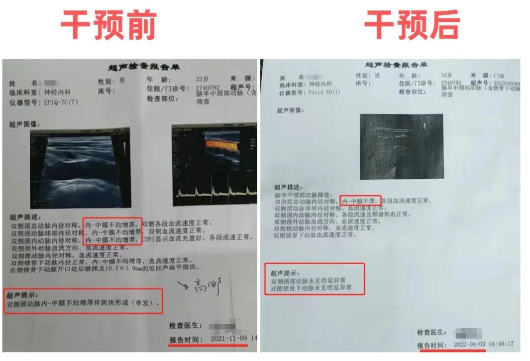对“斑”治疗,该患者已有斑块存在,且因患者个体原因拒绝进行药物治疗,我们在营养治疗基础上,采用非药物干预,选用含纳豆激酶和红曲的营养制剂、含甜菜碱的甲基营养素联合进行营养治疗,达到降脂、溶栓、消斑的效果。