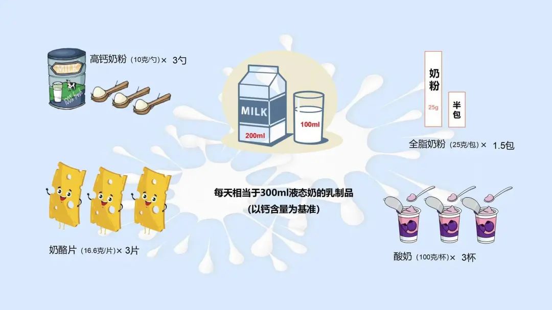 4.吃各种各样的奶制品,摄入量相当于每天300ml以上液态奶。