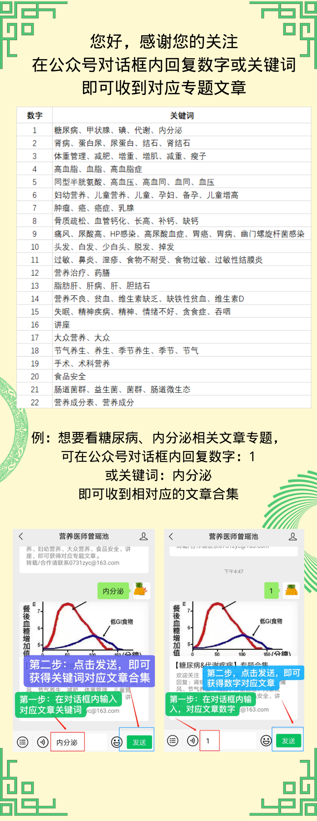 自动回复指引:欢迎关注【营养医师曾瑶池】微信公众号!回复以下关键词或数字:肾病、糖尿病、肿瘤、痛风、高血同、骨质疏松、骨健康、血管钙化、减肥、体重管理、睡眠、幽门螺旋杆菌、胃炎、胃溃疡、胃癌、儿童营养、妇幼营养、大众营养、手术、术科营养、膳食、药膳、肝病、吞咽、精神疾病、节气养生、食品安全、讲座,即可获得对应专题文章。转载/合作请联系0731zyc@163.com。