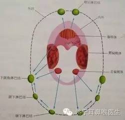 咽部黏膜下淋巴组织丰富,较大的淋巴组织团块呈环状排列,称为咽淋巴环。作为“大哥”,腭扁桃体和咽扁桃体(腺样体)、咽鼓管扁桃体、咽侧索、咽后壁淋巴滤泡及舌扁桃体构成人体的内环,也就是“第一道防线”。内环的淋巴流向颈部淋巴结,这些淋巴结又互相交通,自成一环,称外环,主要由咽喉淋巴结、下颌角淋巴结、刻下淋巴结、颌下淋巴结等,构成外环,也就是“第二道防线”。