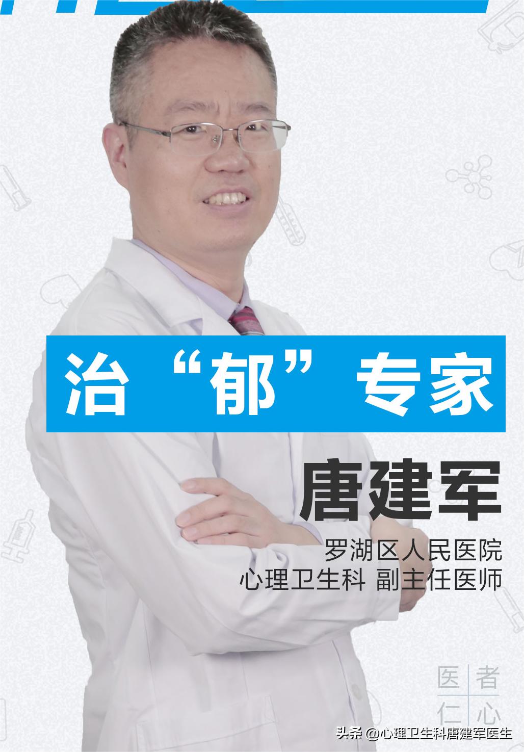 唐建军医生,副主任医师,医学硕士,深圳市医师协会精神科分会第二届理事会副会长,罗湖区高层次人才,就职于广东省深圳市罗湖区人民医院心理卫生科(失眠门诊)。 其在诊断与治疗抑郁症、焦虑症、惊恐症、社交焦虑症、失眠症、强迫症、疑病症/躯体化障碍/健康焦虑症、双相情感障碍(心境障碍)、神经性贪食症等多种心理精神疾病方面,皆具备丰富的临床经验与诊治心得,力主采用药物治疗与心理治疗相融合的模式,以推动患者的康复进程。