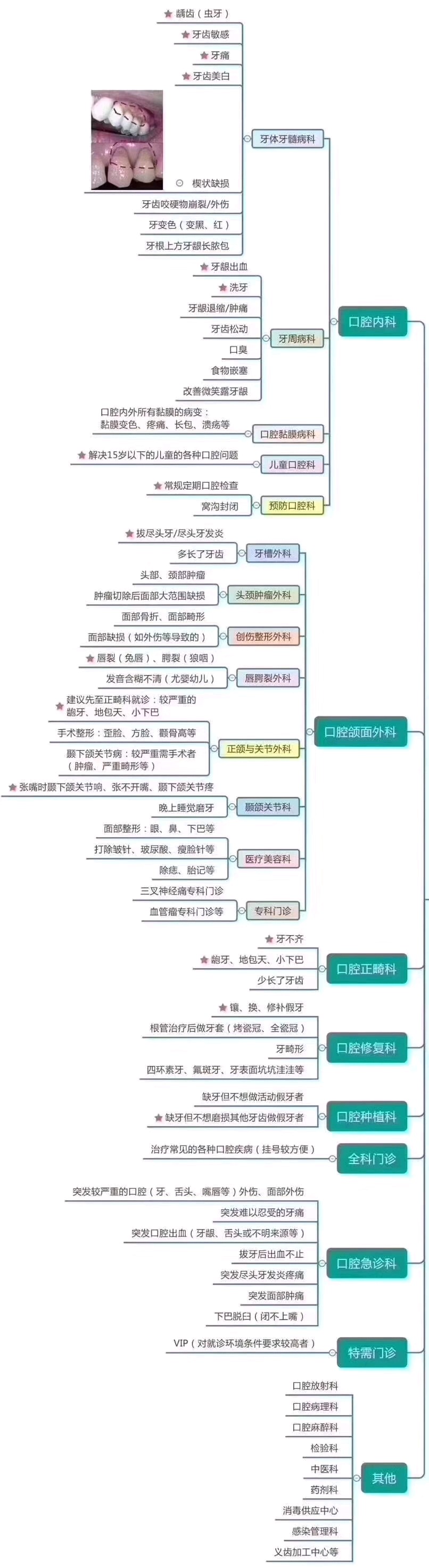 牙痛,蛀牙需要补牙,根管治疗的患者请挂牙体牙髓科,儿童补牙,牙痛一般挂儿童牙科,因为儿童牙科医生相对稀缺,一般医院把它归并在牙体牙髓科;牙龈出血,牙齿松动,牙周炎请挂牙周科;拔牙,肿块需要手术的患者等请挂口腔颌面外科;镶牙,牙齿美容,种植牙请挂口腔修复科;牙齿不齐,地包天等需要矫正的请挂口腔正畸科;口腔溃疡,粘膜起疱,糜烂患者请挂口腔粘膜科!