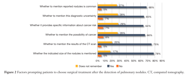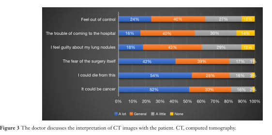 研究还调查了发现肺结节后促使患者选择手术治疗的因素及医生与患者讨论CT图像的解读。这一研究为临床医生提供了宝贵的见解,使他们更好地理解肺部小于8mm结节患者的心理状态和影响因素。医生在制定治疗方案时,除了考虑患者的身体状况和疾病特点外,还需要关注患者的心理状态和焦虑情绪。通过给予更准确的建议和心理支持,医生可以帮助患者更好地应对焦虑情绪,提高治疗效果和生活质量。
