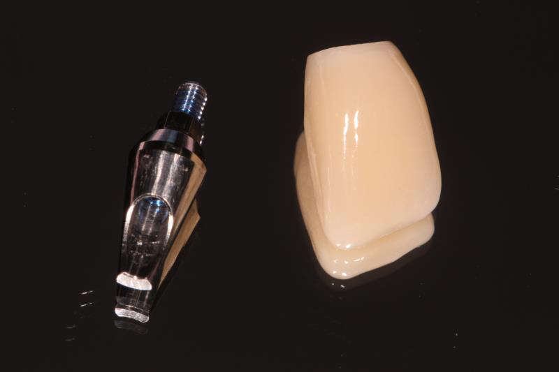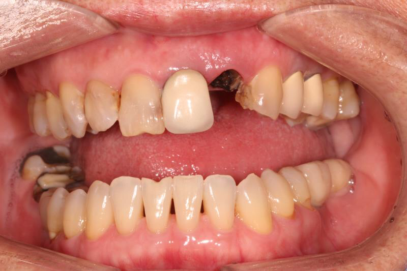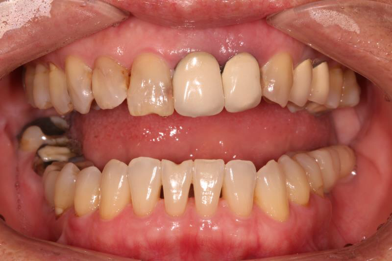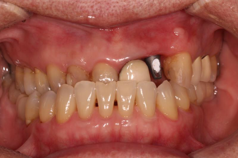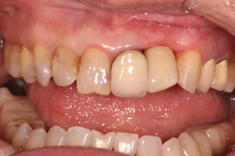 患者中年女性,左上侧切牙外院烤瓷冠修复多年,因松动前来就诊,由于牙冠制作不够密合,取下牙冠后发现牙齿已经腐烂成残根,已经没有办法留住,只能进行种植修复,且因拖延时间过久,慢性炎症造成骨吸收,术中植骨、盖膜、CGF覆盖,最大程度保证了美观性。
