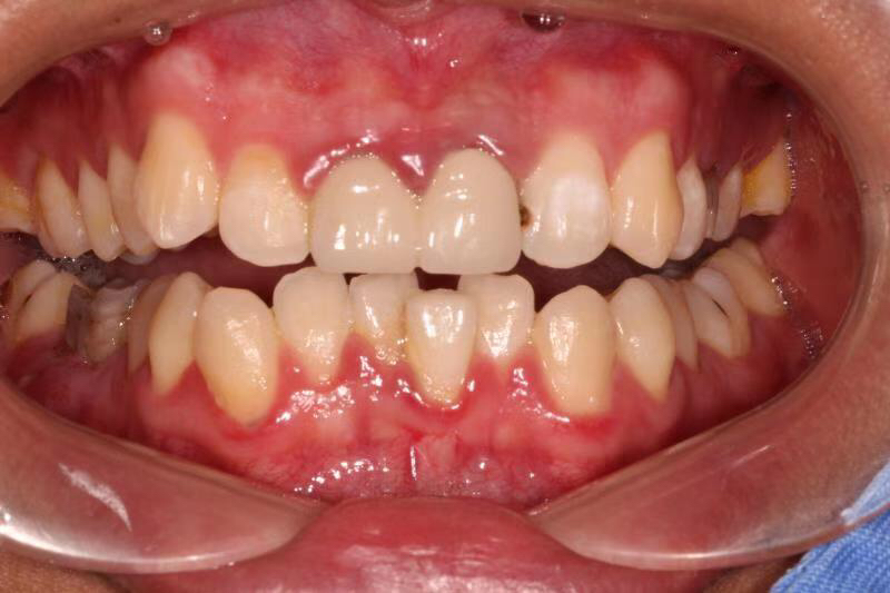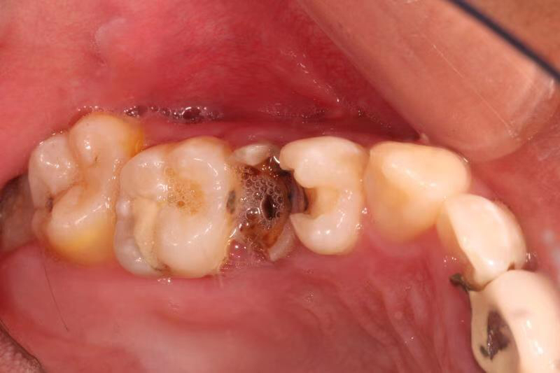 患者年轻男性,左上5号牙因龋坏未及时处理已经腐烂成残根无法修复,只能进行种植修复,且因拖延较久,慢性炎症造成骨吸收,术中植骨盖膜,戴牙后患者满意,按时复诊检查未见异常。