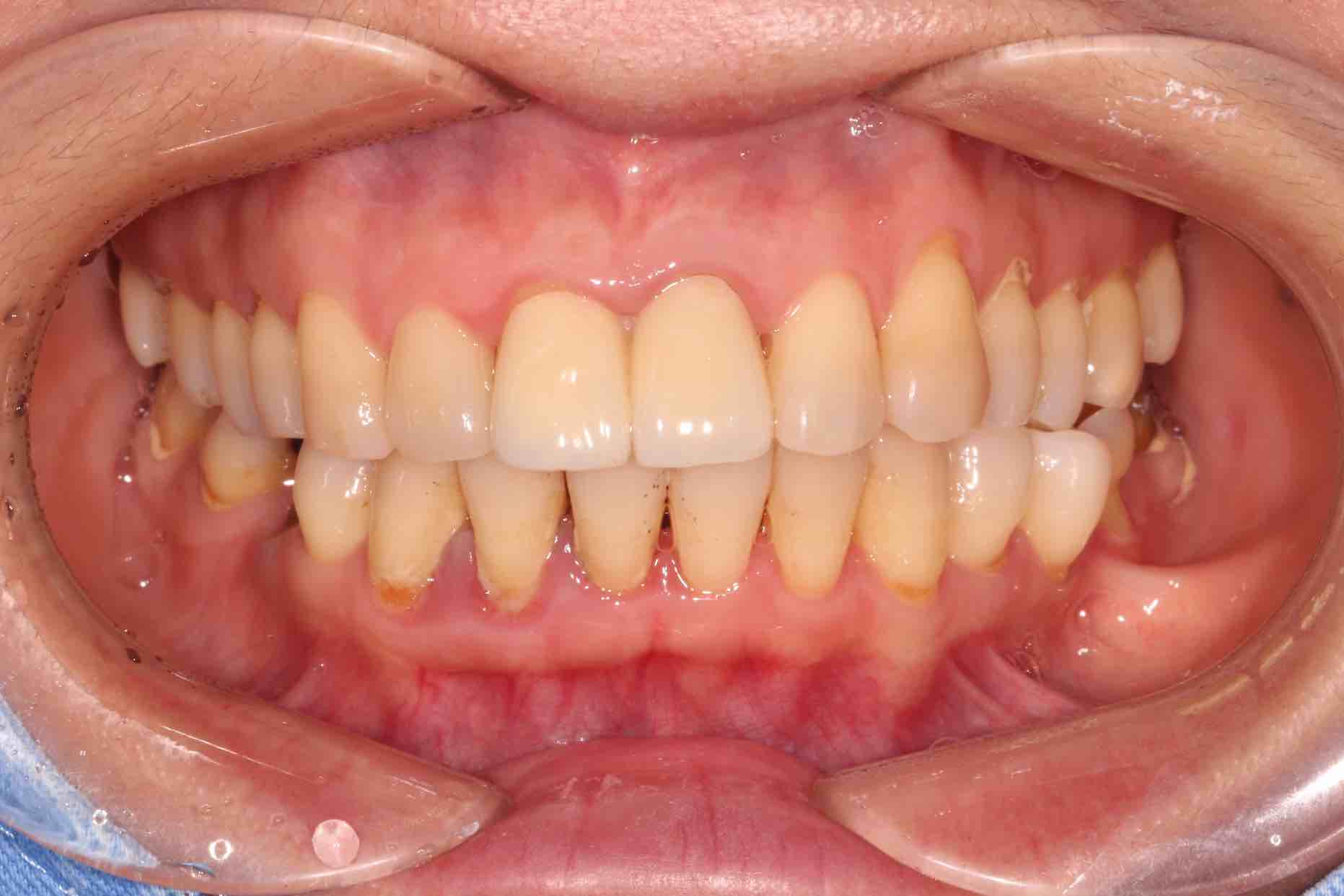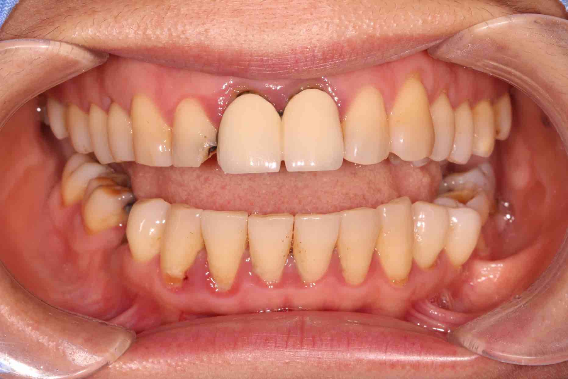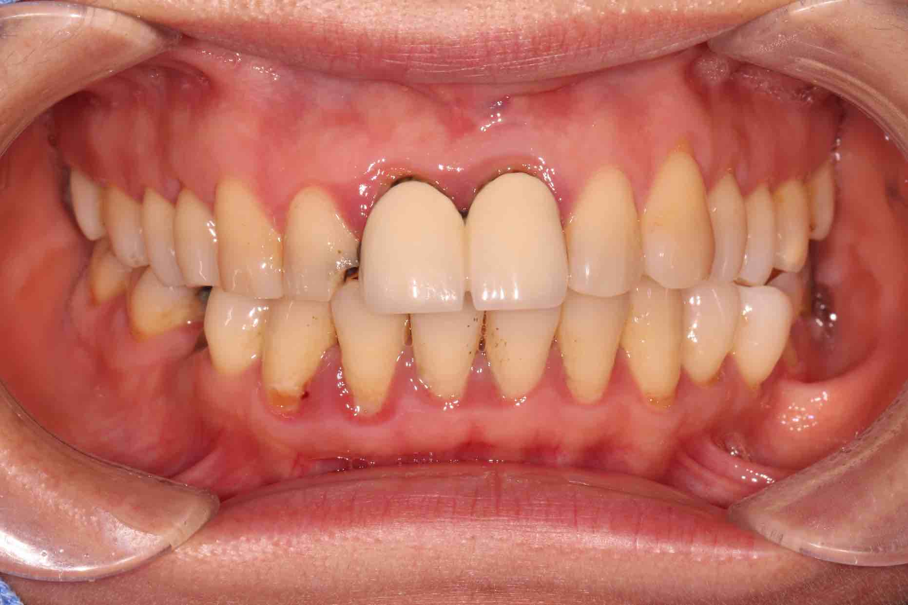 患者中年女性,11、21外院制作烤瓷冠,冠边缘不密合,牙龈退缩发黑,龈缘红肿,颜色不美观且X线检查21根管治疗不完善,由于牙冠不密合,11严重龋坏已有牙髓炎症状,我们对11进行了根管治疗,21进行了根管再治疗,最后CEREC扫描修复。