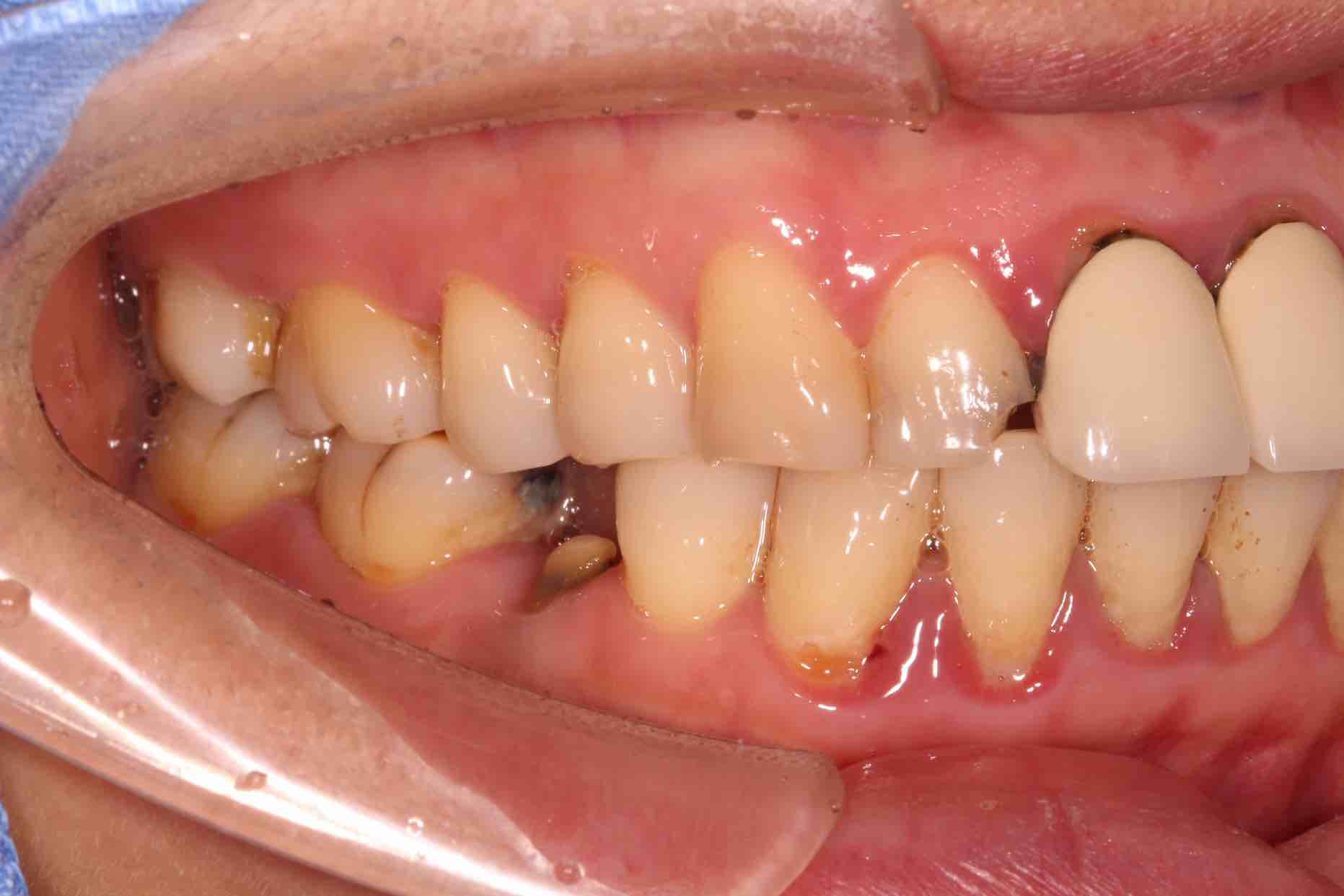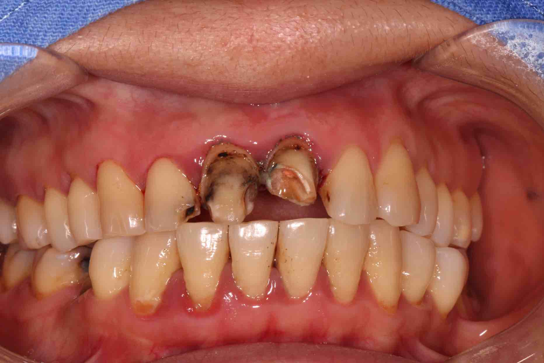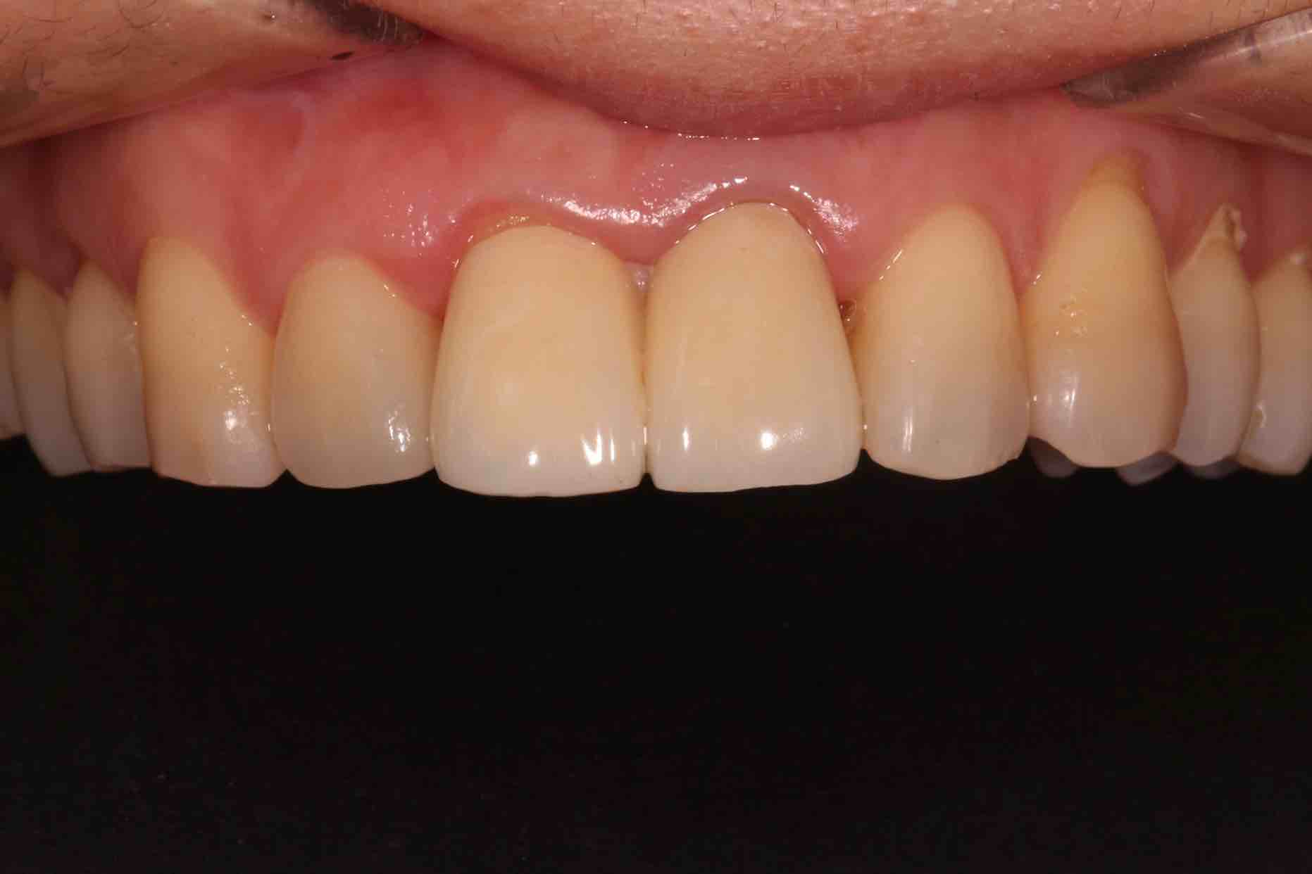 患者中年女性,11、21外院制作烤瓷冠,冠边缘不密合,牙龈退缩发黑,龈缘红肿,颜色不美观且X线检查21根管治疗不完善,由于牙冠不密合,11严重龋坏已有牙髓炎症状,我们对11进行了根管治疗,21进行了根管再治疗,最后CEREC扫描修复。