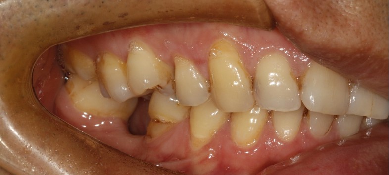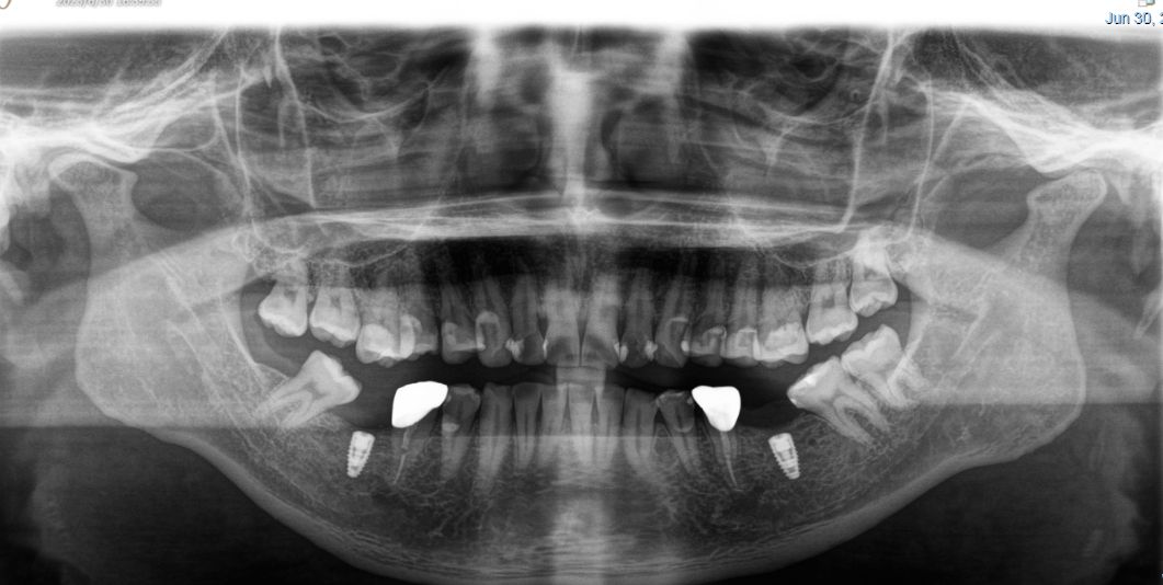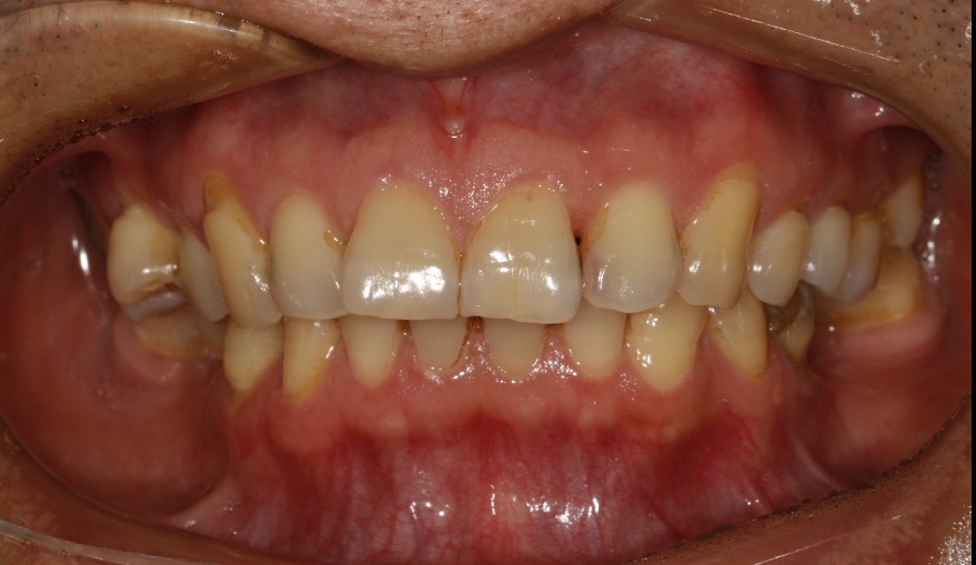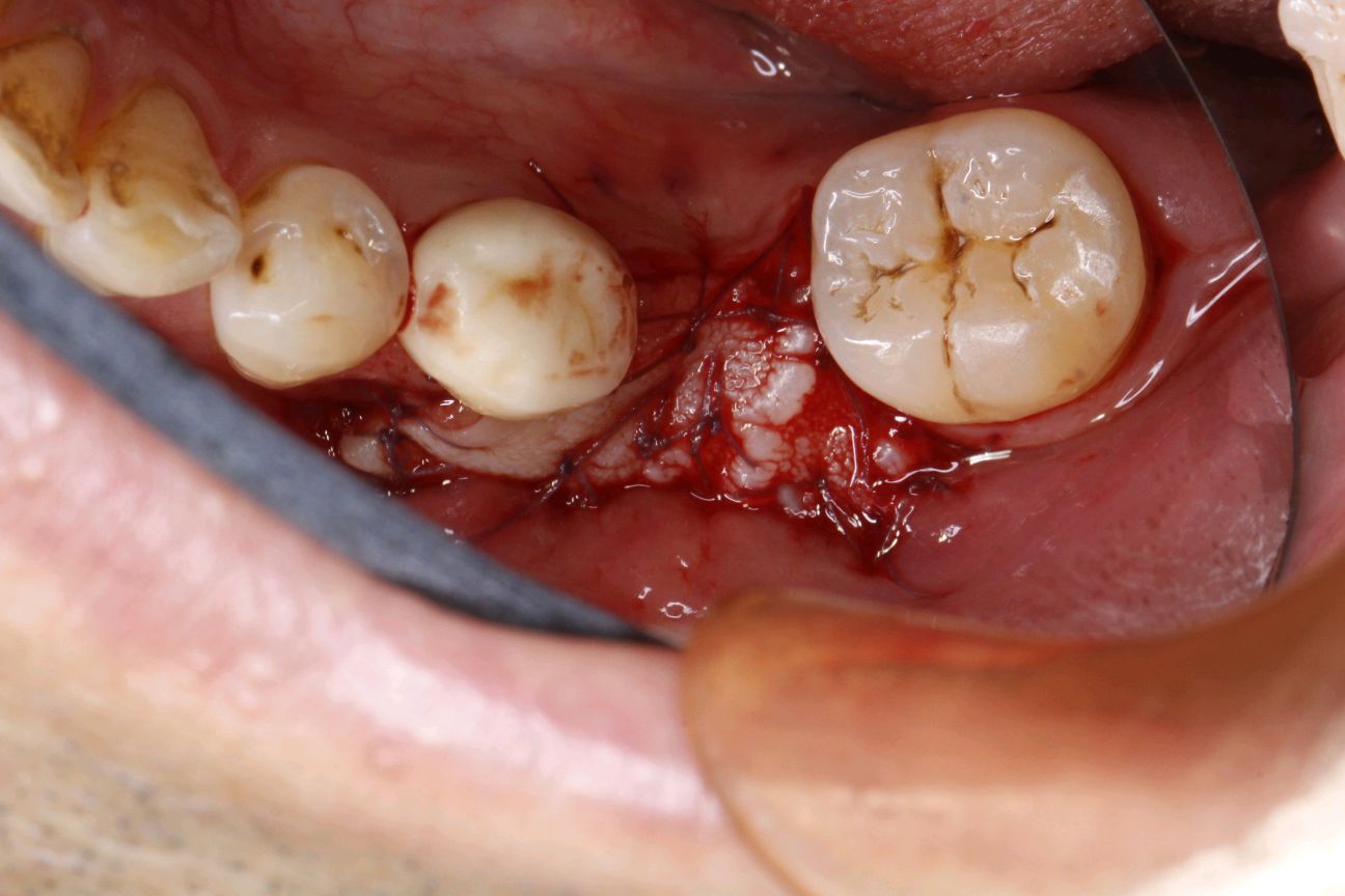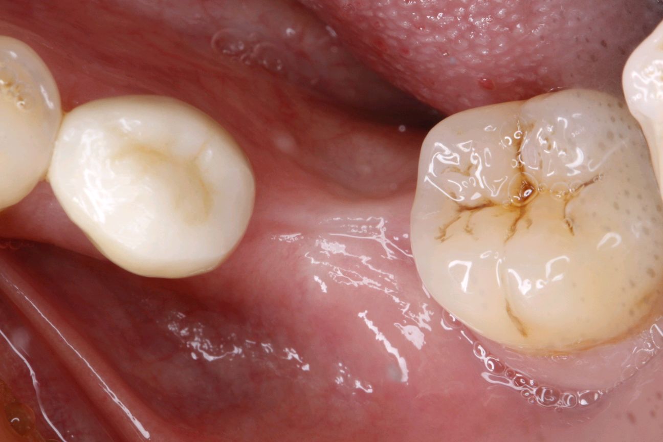 患者男,四十四岁,36,46缺失已植入种植体,附着龈不足,缺牙区牙槽嵴呈刀刃状,缺牙区咬合间隙及近远中间隙尚可。可行游离牙龈移植术增宽种植体周围附着龈的面积。
