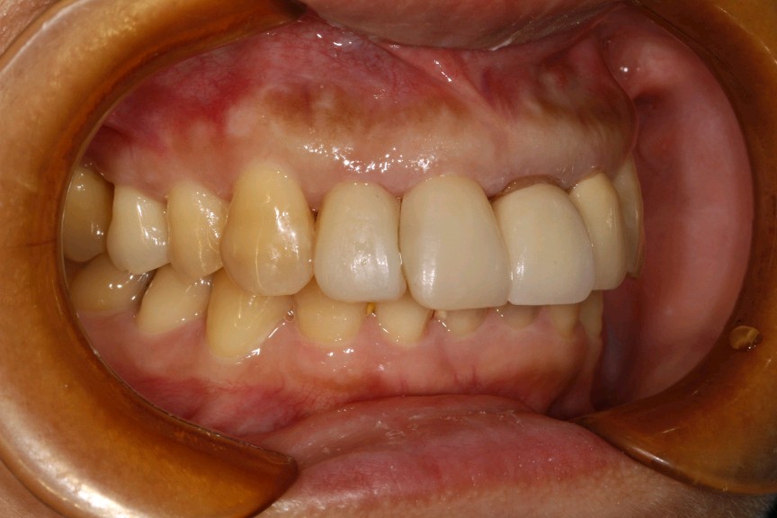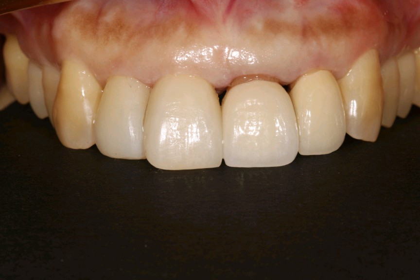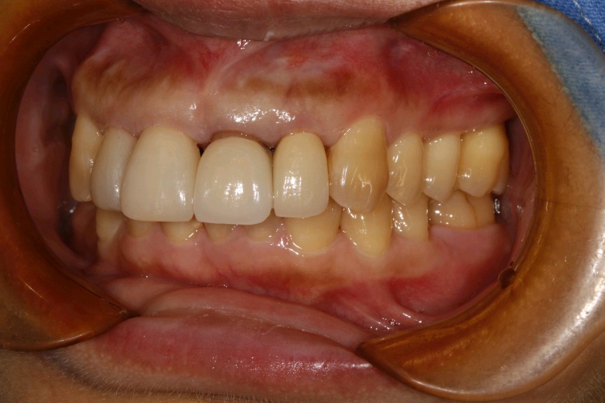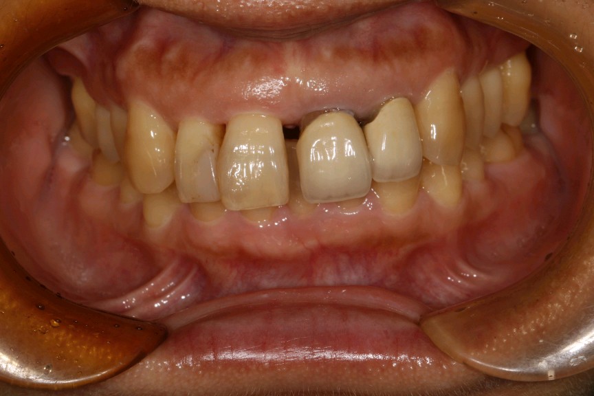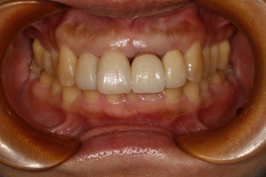 患者女,45岁。患者自述有刷牙出血症状,探易出血,探及牙周袋深度5mm,可探及袋内牙石3mm。21、22已行根管治疗加桩冠修复,牙龈萎缩,边缘不密合,21牙颈部楔缺。中切牙之间缝隙较大。12邻面部分充填物。。X线示根尖无阴影。患者自觉前牙不美观,要求重新修复。