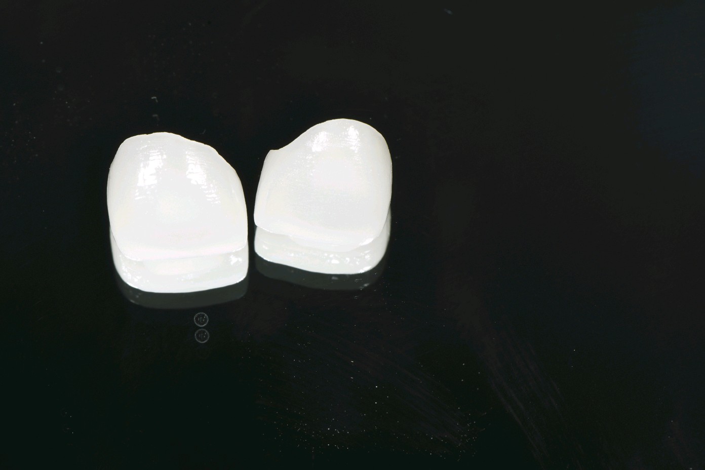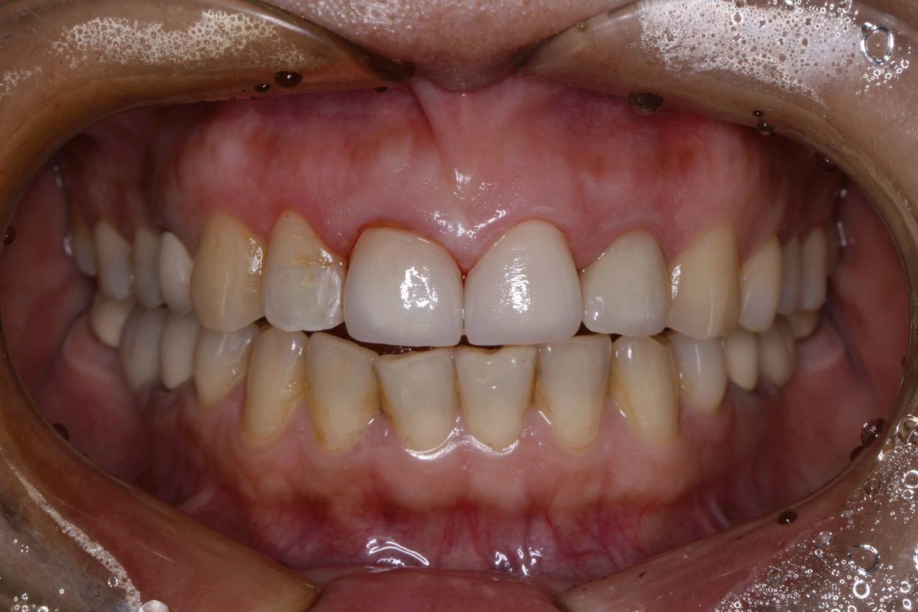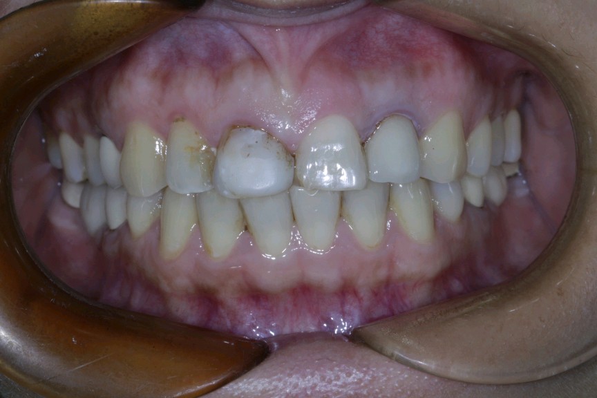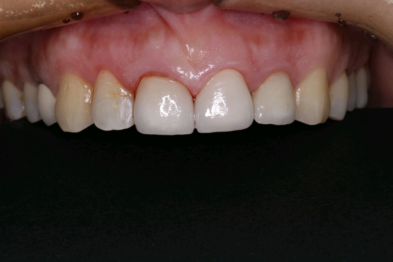 患者女,四十岁,11树脂贴面修复近五年,已氧化着色,形态色泽有差异,要求重新修复。近几日来我院就诊。治疗计划:中切牙贴面修复。基牙预备后CEREC扫描,于今日戴牙。患者满意。