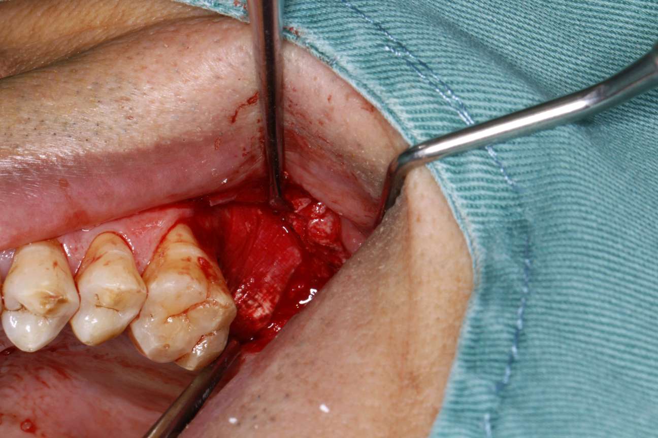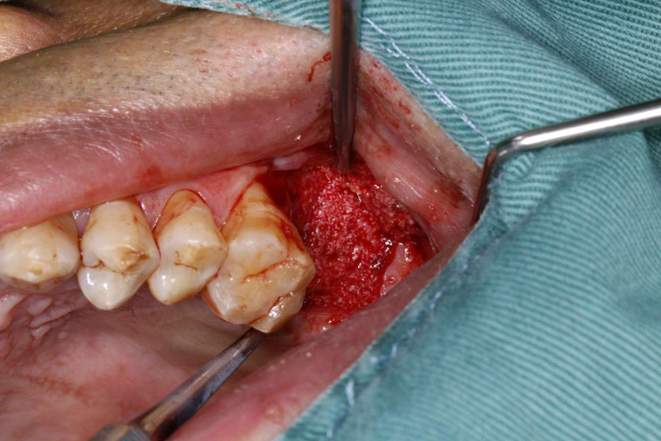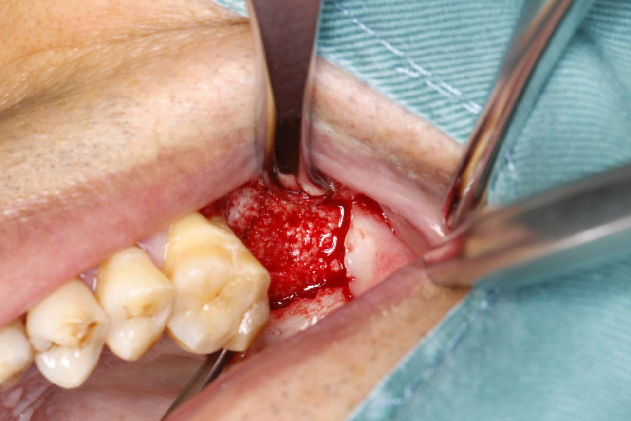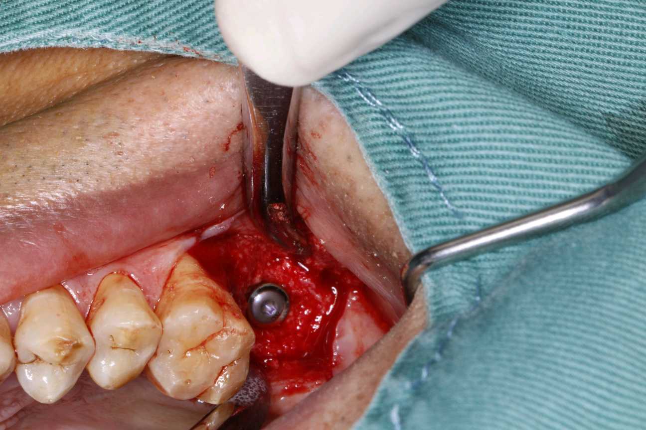 患者知情同意下,抽静脉血30ml,制作 CGF ,0.1%聚维酮碘溶液口内粘膜消毒,0.5%聚维酮碘溶液口外皮肤消毒,4%盐酸阿替卡因肾上腺素注射液2.0ml浸润麻醉,牙槽嵴顶切开粘骨膜,翻瓣。见腭侧大面积骨缺损,球钻定位,先锋钻导向,骨质钻扩大种植窝,行上颌窦内提,特殊冲顶器械敲击,抬高上颌窦底部骨质和黏膜。并攻丝植入 ITI 种植系种植体4.8*8mm,上封闭螺丝,腭侧骨缺损区植 bio - oss 骨粉0.25g及 CGF ,并盖 bio - Gide 膜及 CGF 膜,严密缝合,常规医嘱,15天拆线,抗生素自备。