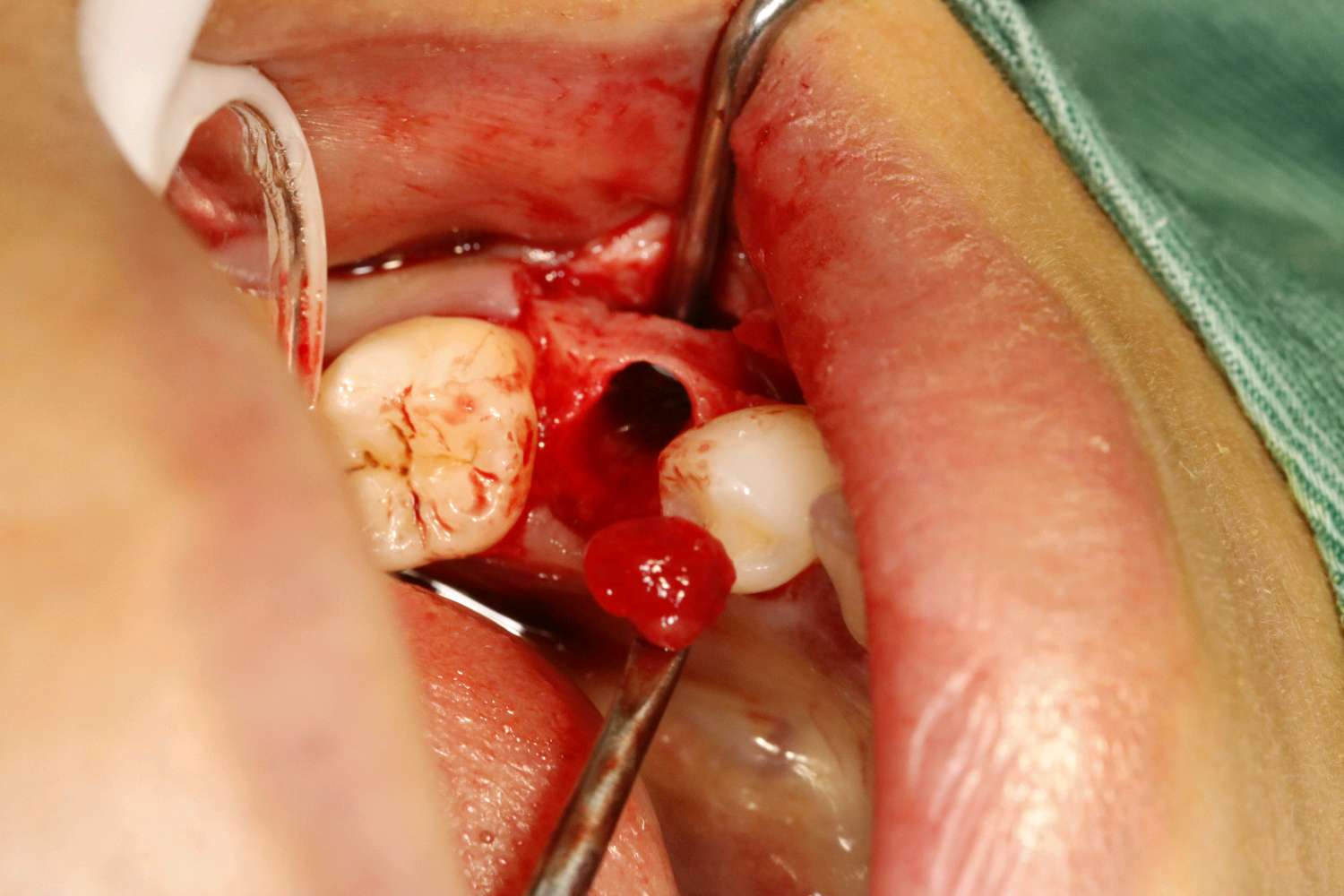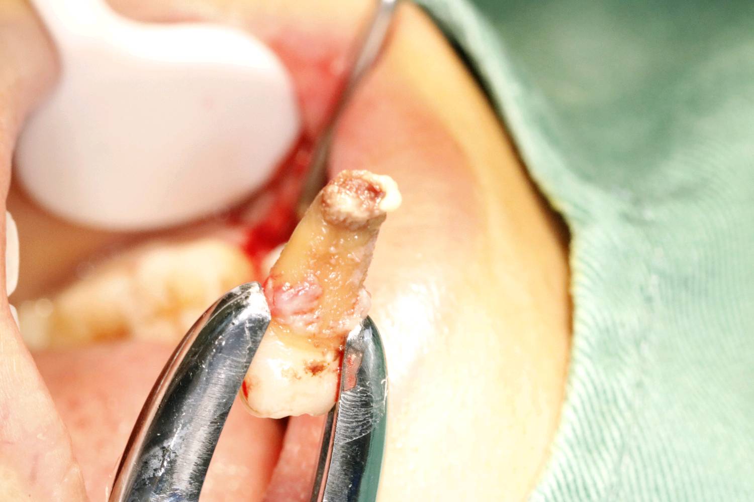 畸形中央尖多发生于下颌第二前磨牙,是一种牙体形态的发育异常,畸形中央尖本身不是什么大问题,只是折断或者磨穿了才会有不好的后果。这位患者就是因为没有长期的磨耗使的根尖周发生炎症时,导致根尖发育停止,根管口呈喇叭口状。对于这种牙根过短,根尖炎症范围过大的患牙,则考虑给予拔除。拔出后植入骨粉骨膜,后期种植修复。