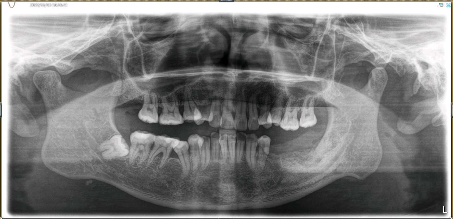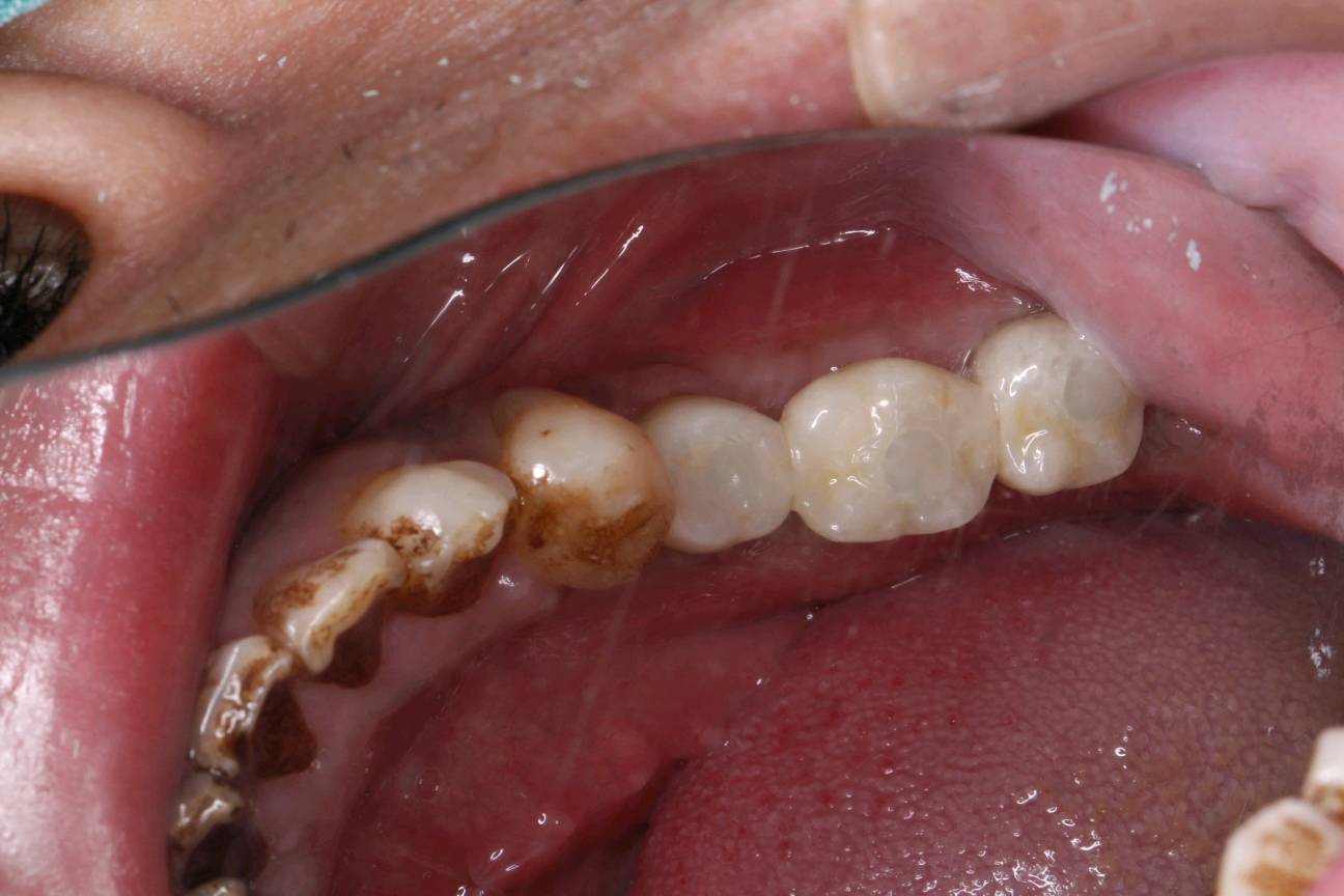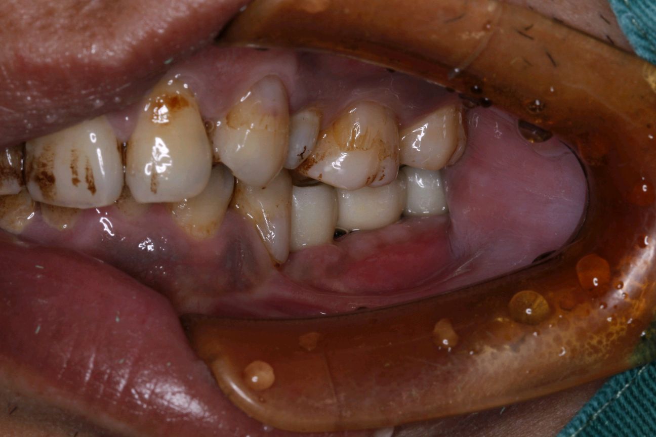 患者男,四十岁,全口口腔卫生较差。牙石+++,色素+++。左下后牙松动,X线示全口牙槽骨水平性吸收,35 36,37牙槽嵴吸收至根尖1/3。