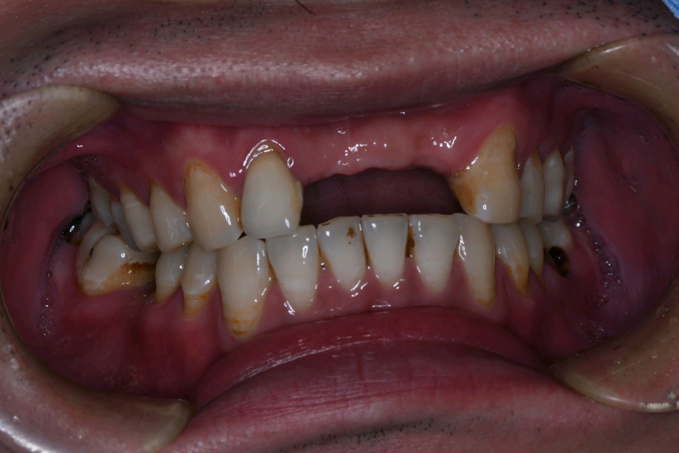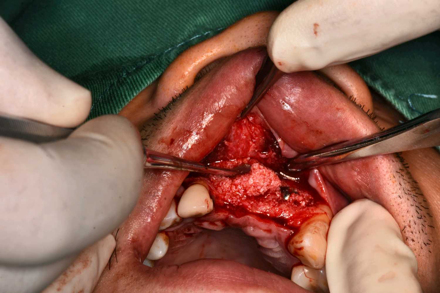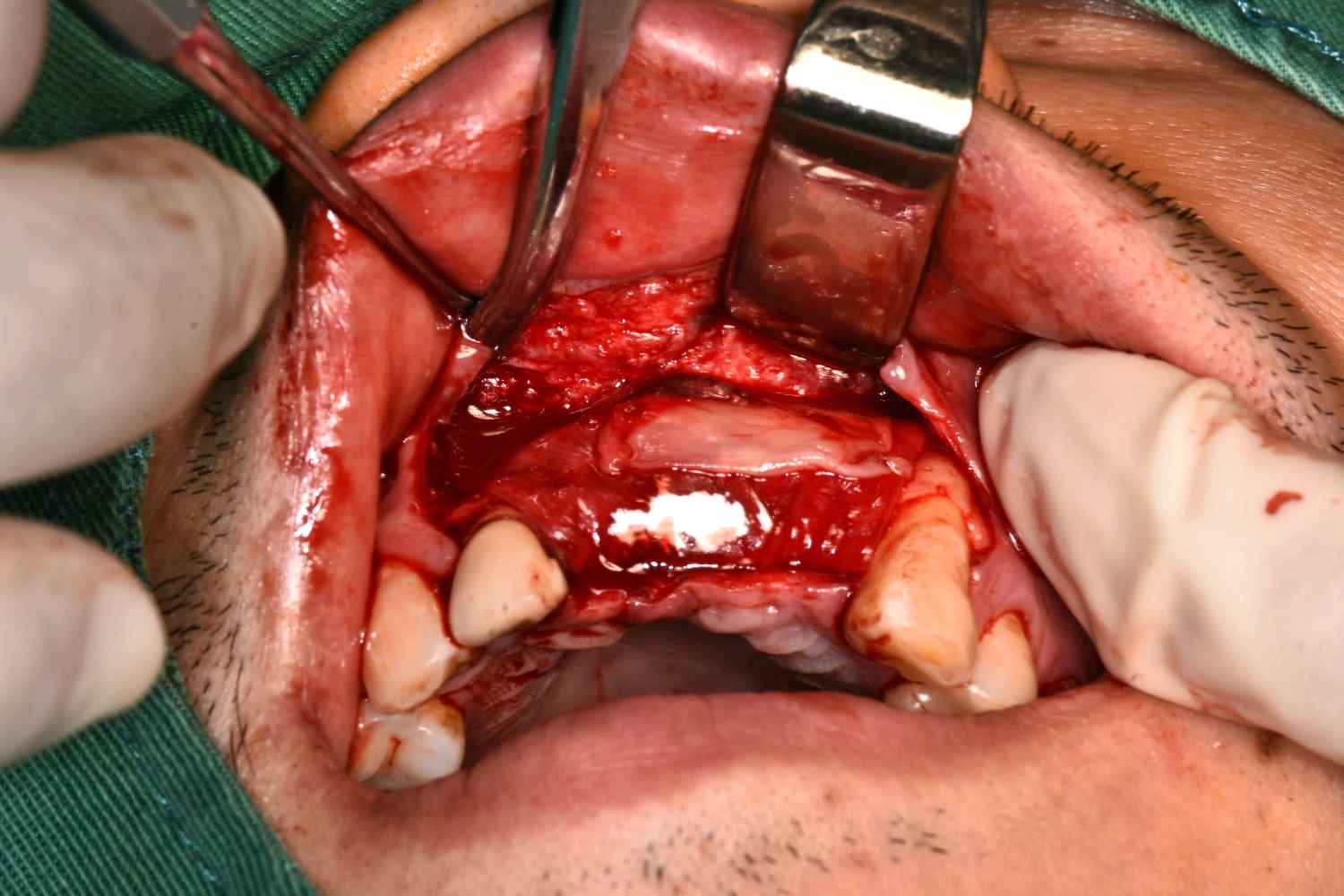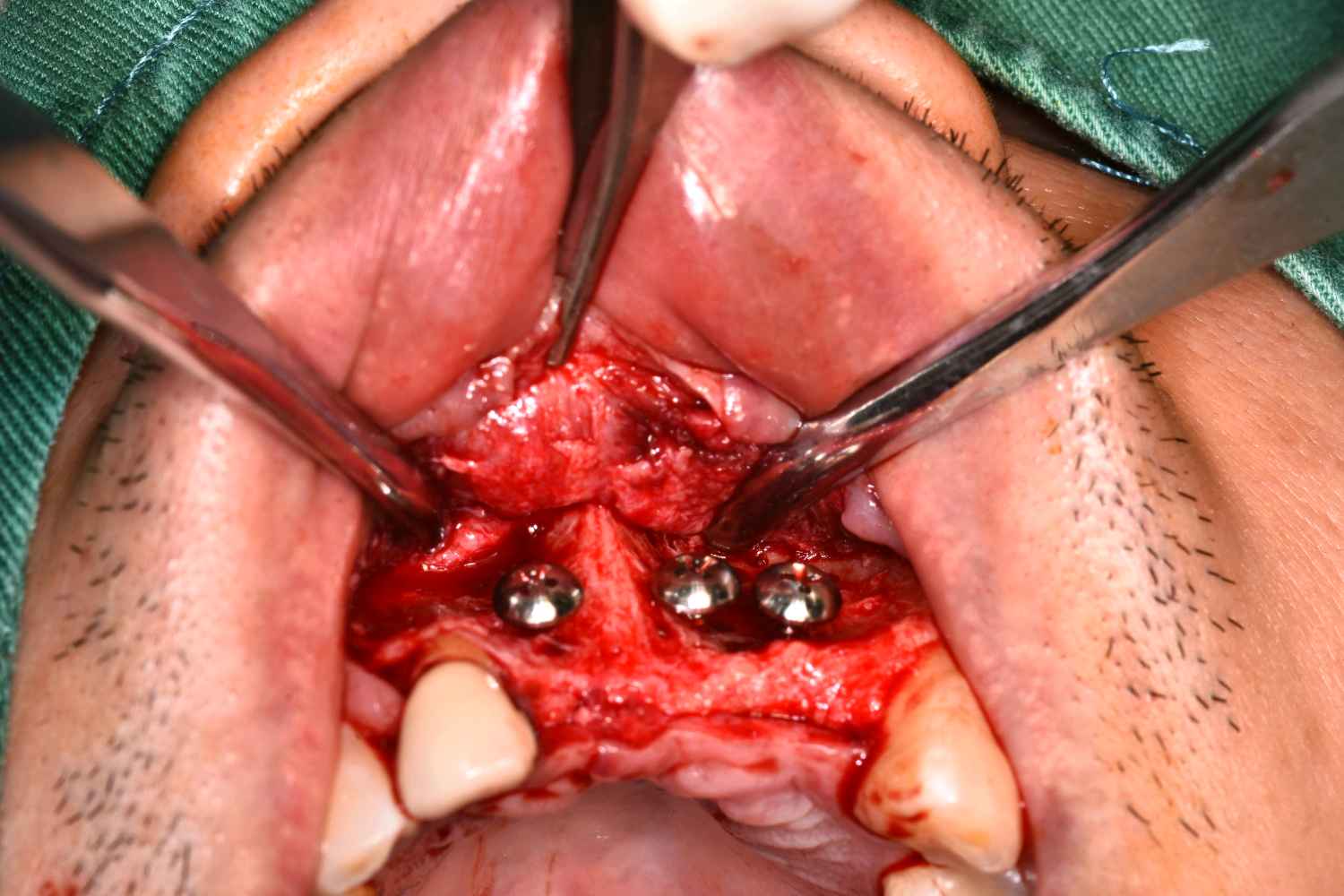 患者男,三十岁,12、11、21缺失。X线示牙槽嵴垂直和水平骨宽度不足。颊侧凹陷缺牙间隙正常。中度萎缩,无骨尖、软组织的增生,牙龈无红肿,角化龈充足。这位患者很符合帐篷钉技术的适应症。通过植入帐篷钉固定植骨材料,给新骨的再生创造了一个稳定的局部环境和生长的空间。最后植入骨粉骨膜及CGF膜,严密缝合。待骨成型即可种植修复。