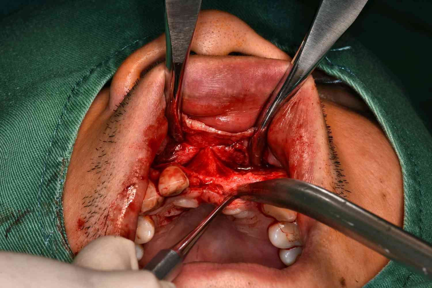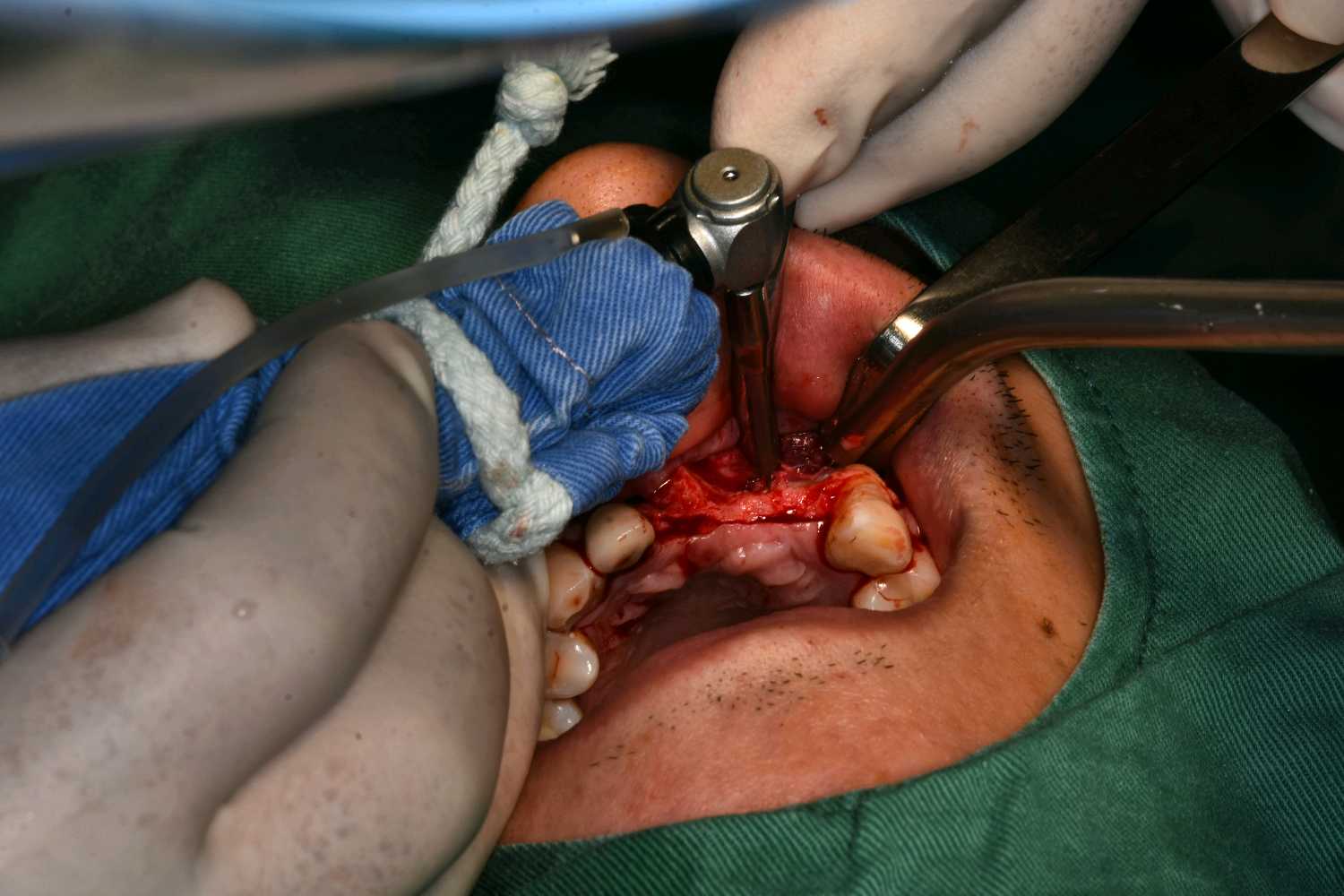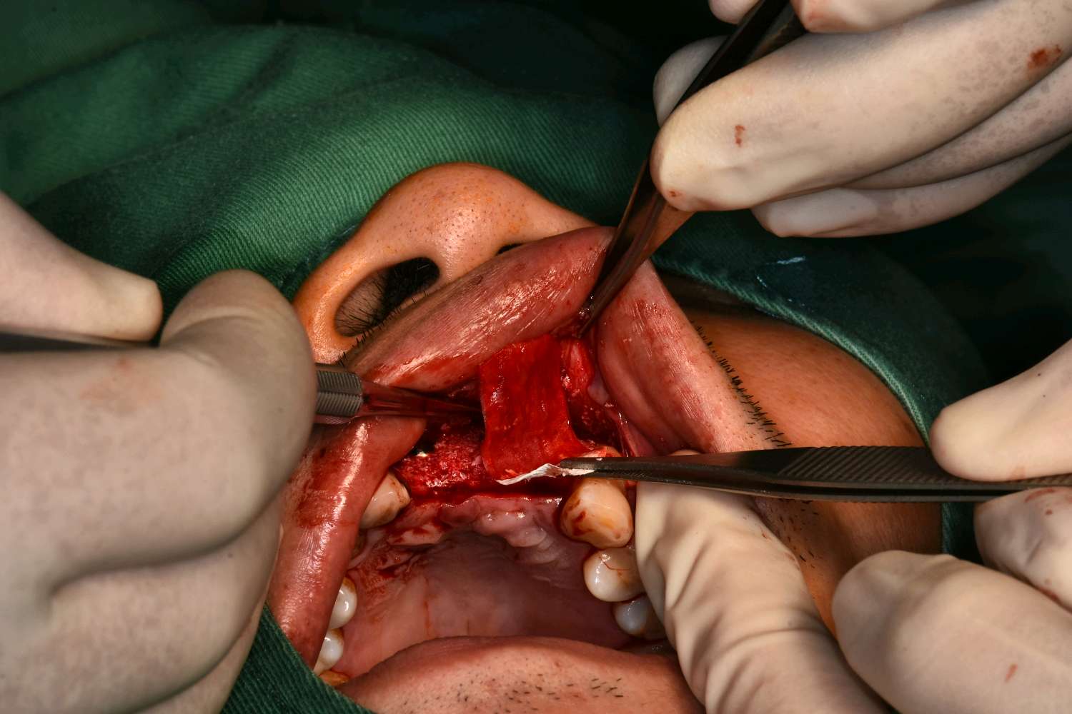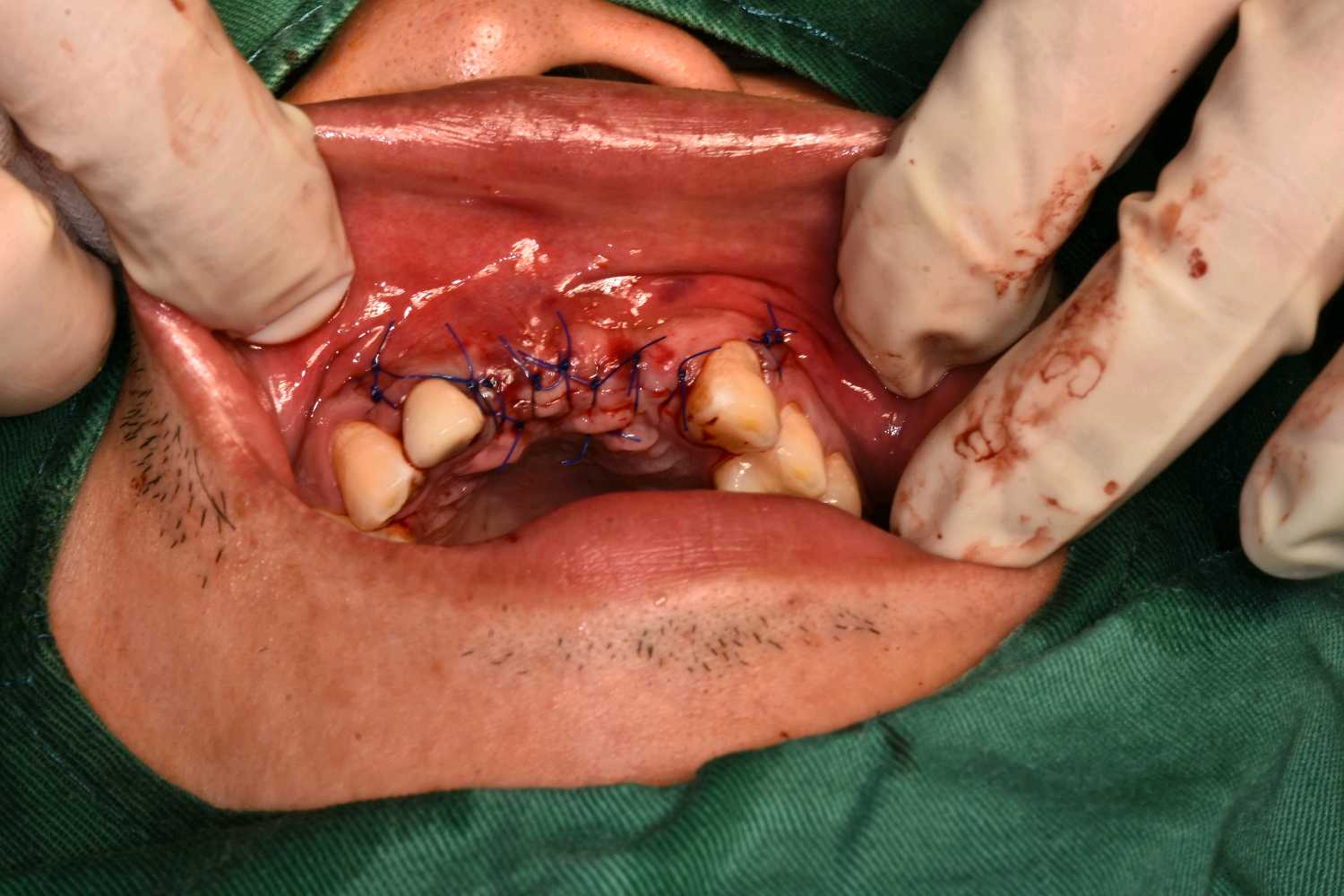 患者男,三十岁,12、11、21缺失。X线示牙槽嵴垂直和水平骨宽度不足。颊侧凹陷缺牙间隙正常。中度萎缩,无骨尖、软组织的增生,牙龈无红肿,角化龈充足。这位患者很符合帐篷钉技术的适应症。通过植入帐篷钉固定植骨材料,给新骨的再生创造了一个稳定的局部环境和生长的空间。最后植入骨粉骨膜及CGF膜,严密缝合。待骨成型即可种植修复。