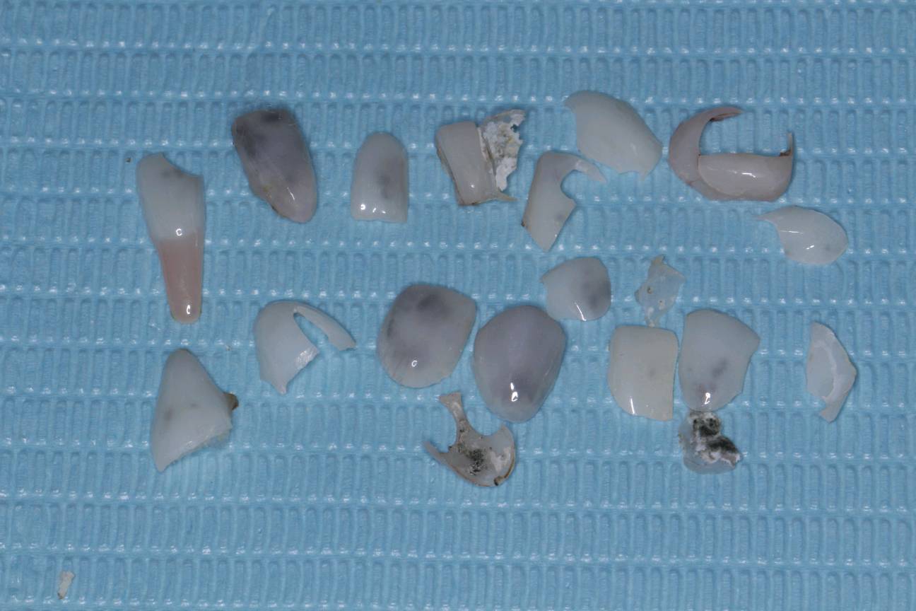 患者女四十岁,外院做瓷贴面16颗,刷牙出血,牙龈红肿出血,自觉异物感,色泽偏白,不美观,要求拆除其余修复体。听闻本院有饵激光拆除贴面的方法,特意从外地赶来,选用饵激光拆除尽量减少基牙损伤。传统的拆除方法像磨牙一样,一颗两颗还行,多颗的话会很辛苦,而且不可避免会磨掉自己的牙齿。所以相对于传统的拆卸方法,饵激光拆除用时会比较短,患者基本感觉不到疼痛,大大减少了拆除瓷贴面时对牙齿的损伤。无创,无痛,且高效。拆除瓷贴面后,精细的抛光打磨。恢复本有牙体形态和色泽,患者满意。