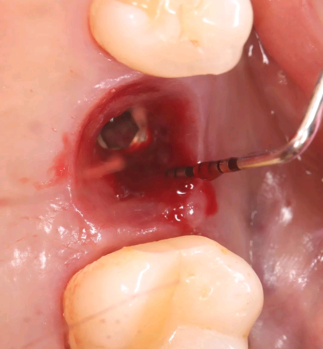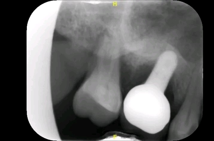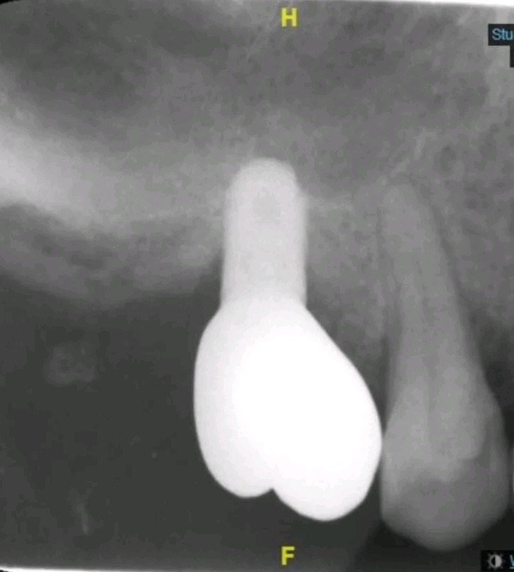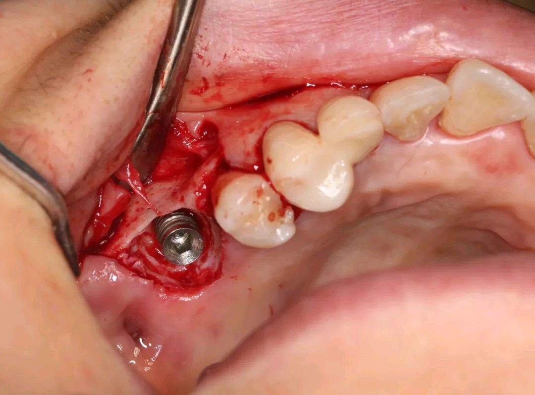 患者女性,56岁, 六年前在某口腔医院,进行右上后牙种植牙一枚,完成修复后。使用了几年后,出现局部反复肿胀疼痛出血,来我院就诊。