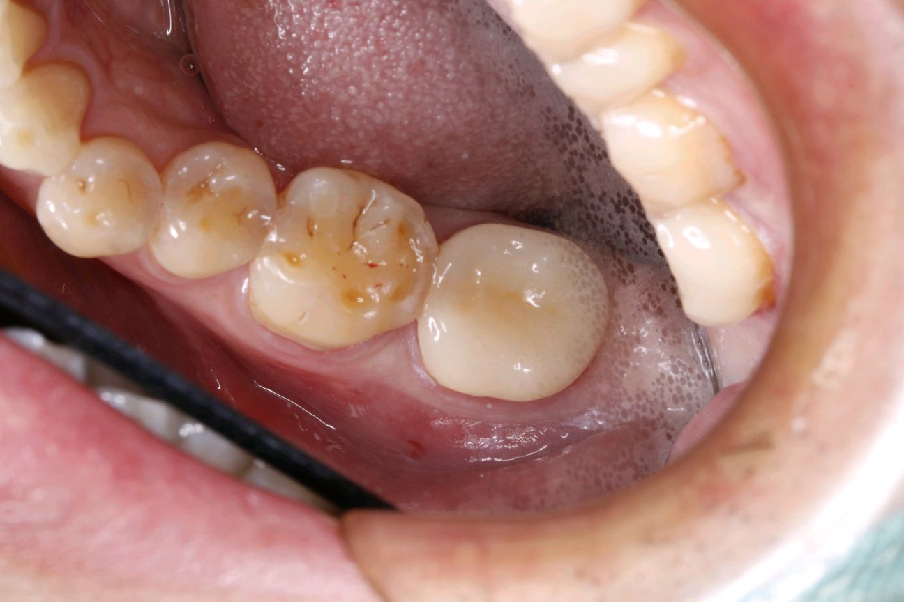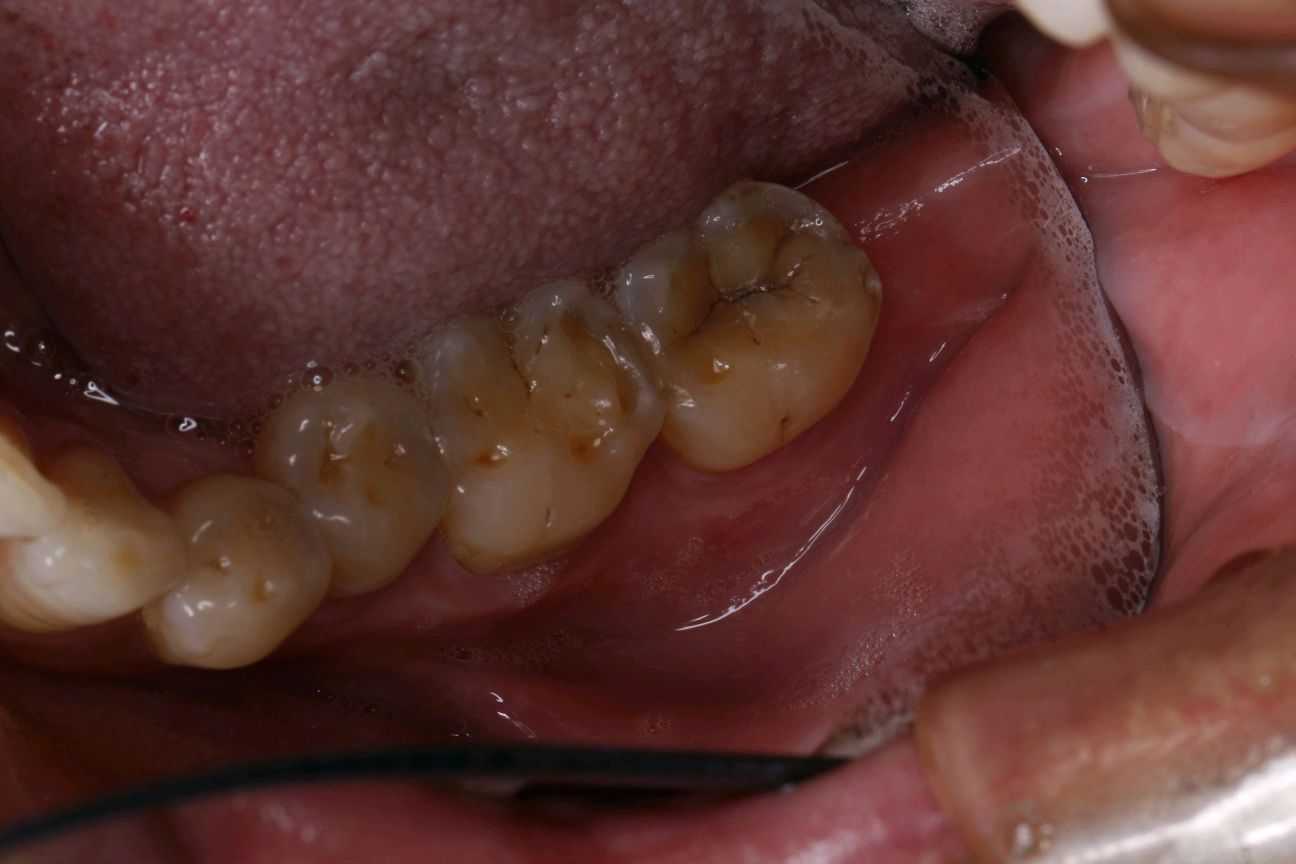 患者男 60 岁, 诉牙齿进食冷热酸痛敏感。检查发现后牙颌面及远中面龋坏。