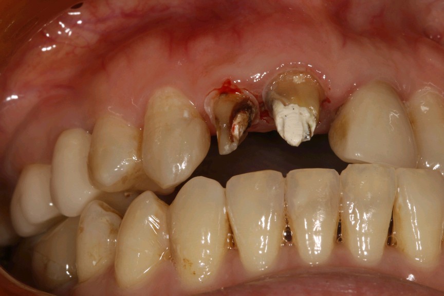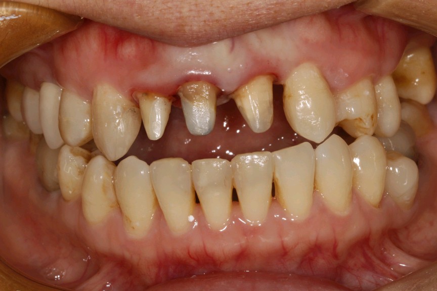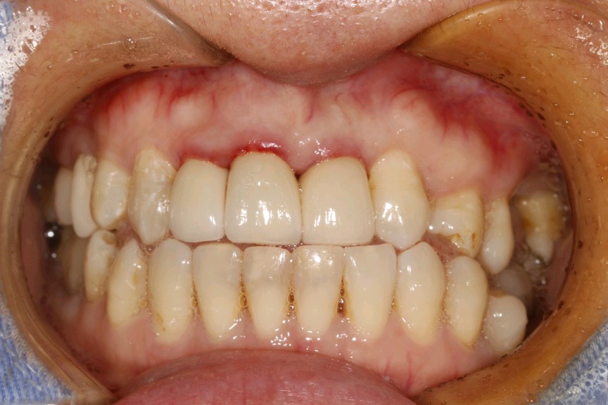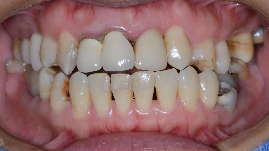 患者女,三十岁,11、12、21牙已行根管治疗,11、21烤瓷全冠修复。由于长时间烤瓷牙的佩戴,导致牙龈边缘发黑,颈缘处牙龈组织出现"黑线"。腭侧部分也出现了崩瓷的现象。对于这种情况,建议患者尽早重新修复,避免二次伤害。患者最终选择重新修复,也给出患者合理的方案,患者选全瓷冠修复,与今日佩戴完毕。边缘密合度良好,形态色泽自然美观,患者满意。