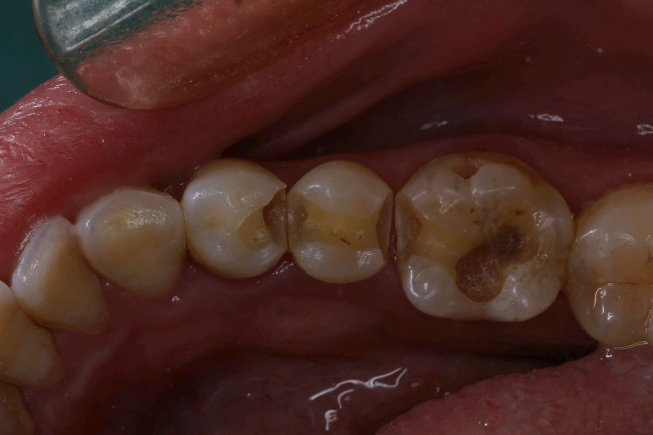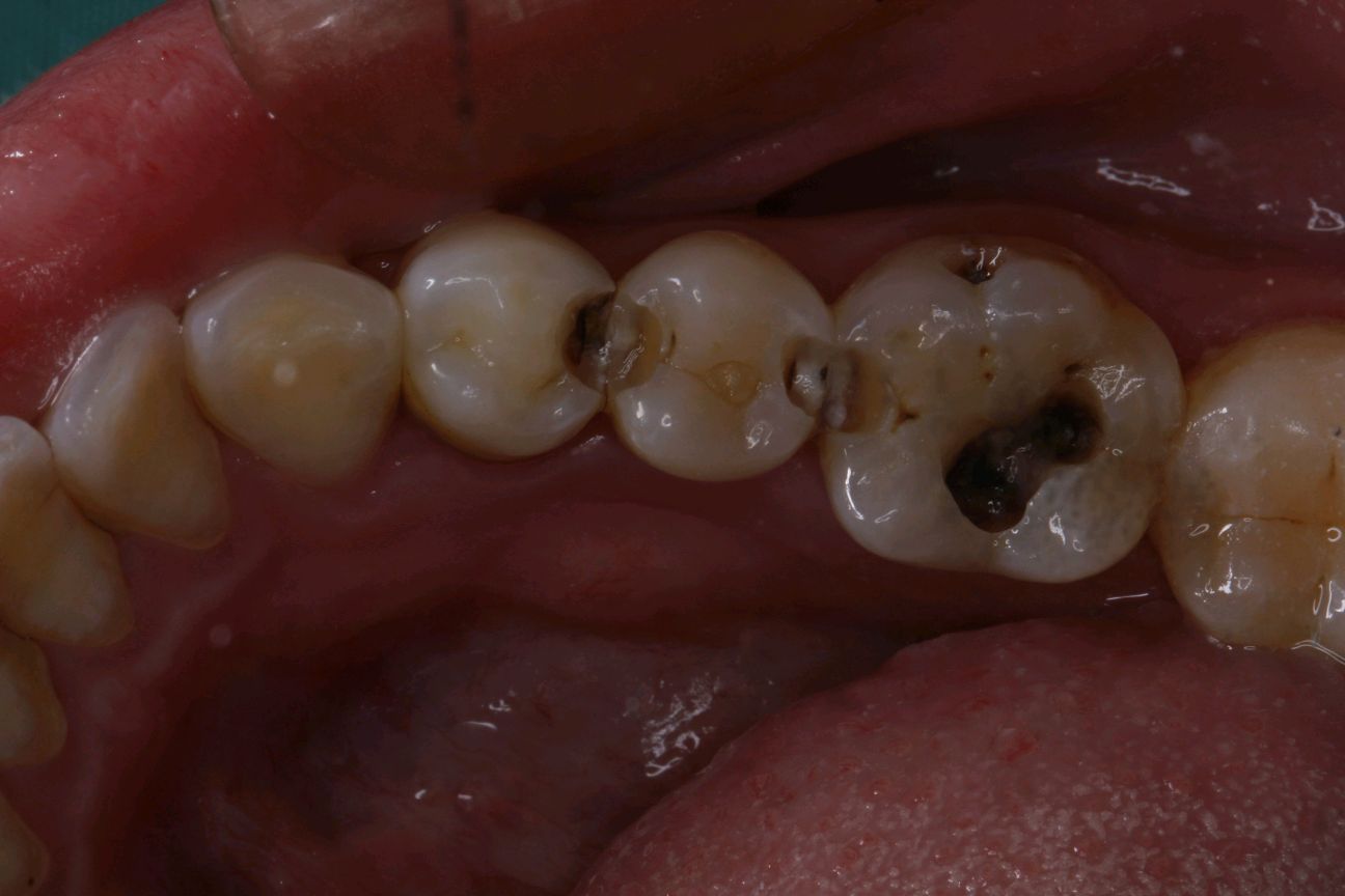 患者女,28岁。主诉左下后牙食物嵌塞。检查发现34、35、36邻面龋坏,色泽发黑,质硬冷测正常,余无特殊。