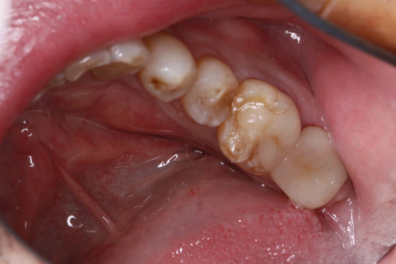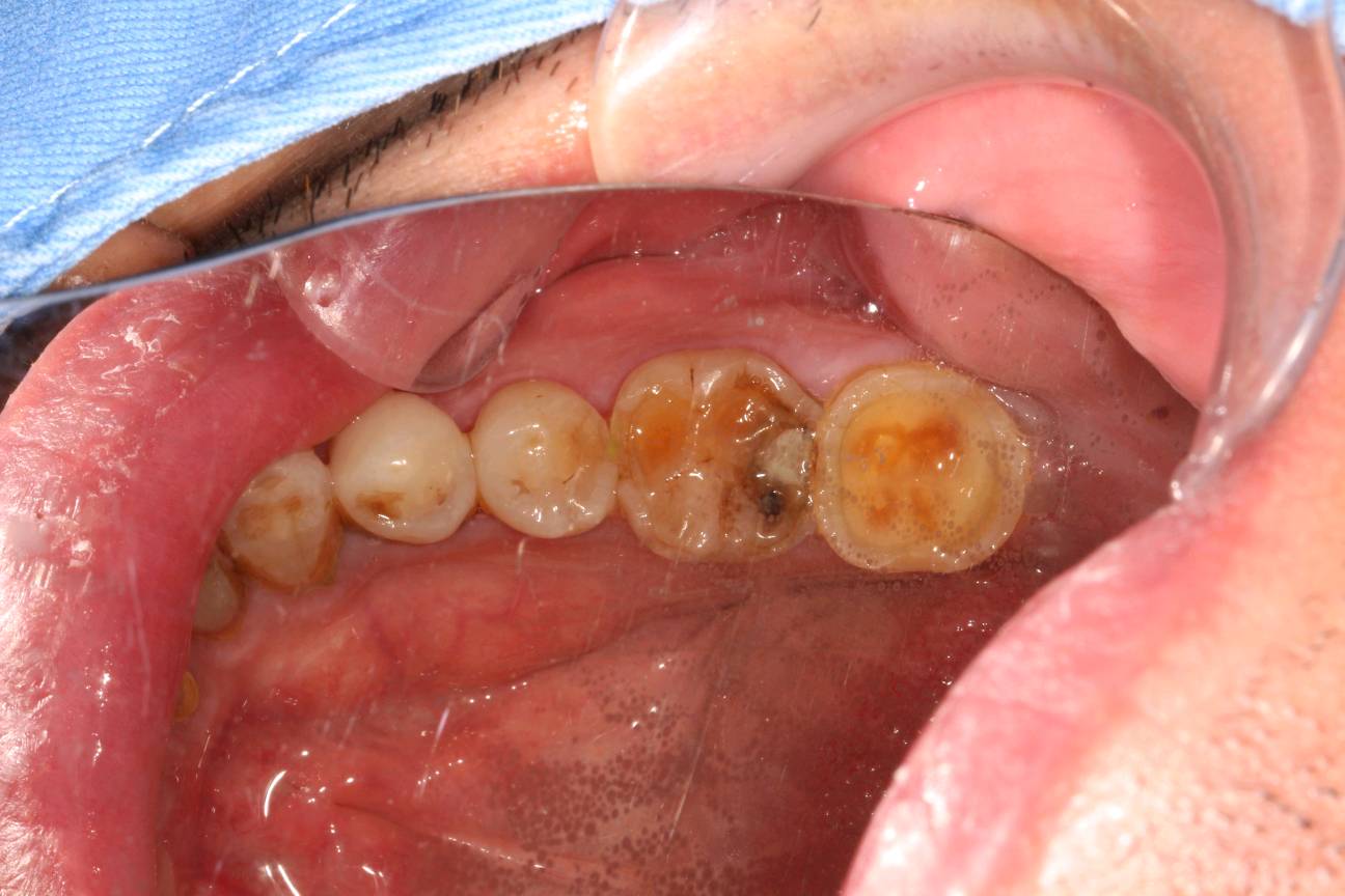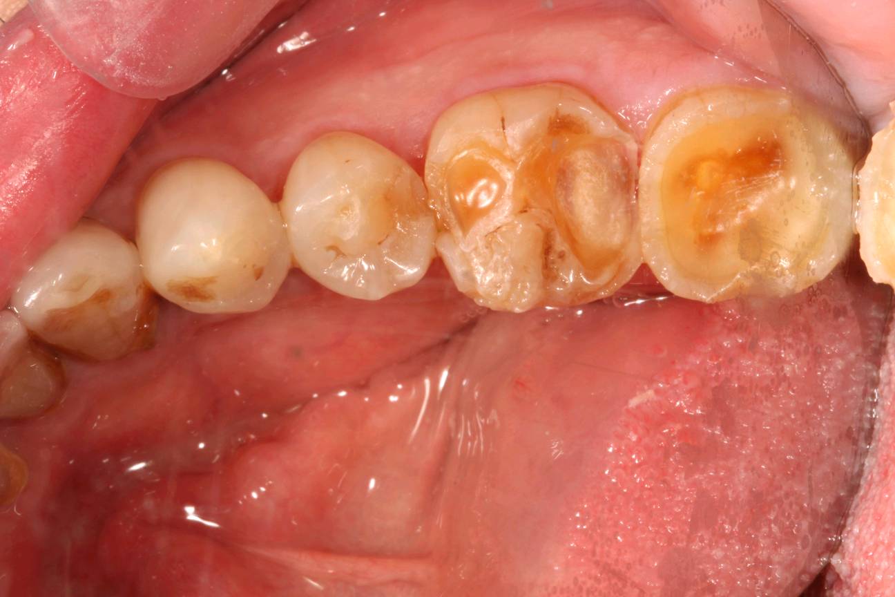 口腔检查: 36 、37 颌面重度磨耗, 叩痛(-),探略敏感,36 冷测同对照牙,37 牙冷测敏感, 不松动,牙龈无红肿。36远中邻颌面龋坏,龋坏至龈下 2mm, 全口口腔卫生一般,牙石(+),软垢(+)。