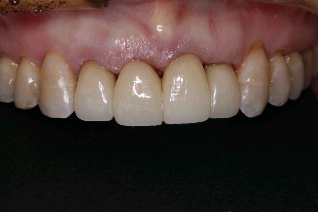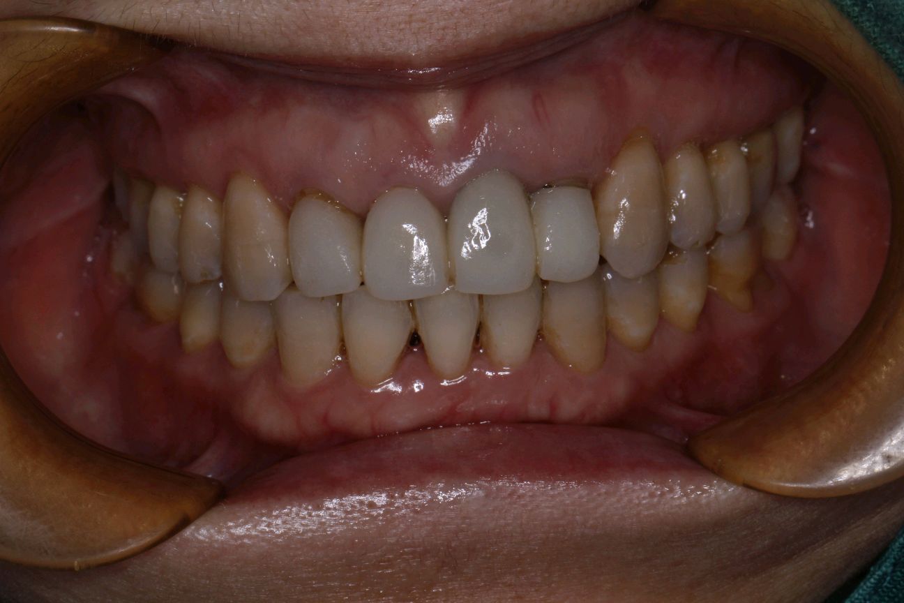 患者女,三十岁,11、12、21,22牙已行根管治疗+烤瓷全冠修复。由于长时间烤瓷牙的佩戴,导致牙龈边缘发黑,边缘不密合,颈缘处牙龈组织出现"黑线"。腭侧部分也出现了崩瓷的现象。对于这种情况,建议患者尽早重新修复,避免二次伤害。患者最终选择重新修复,也给出患者合理的方案,患者选全瓷冠修复,与今日佩戴完毕。边缘密合度良好,形态色泽自然美观,患者满意。