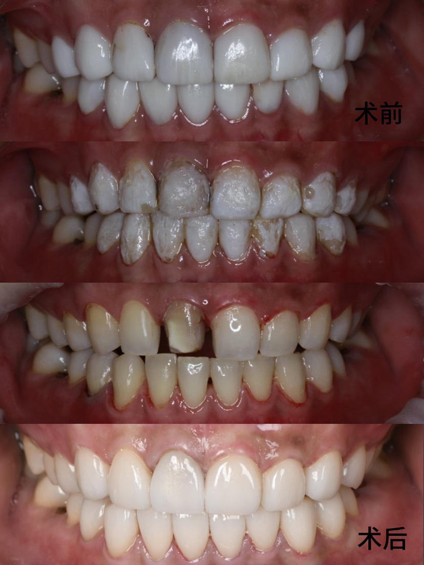 采用黏接技术,用修复材料改善前牙颜色、形态及排列的修复方法。在临床上瓷贴面也是比较耐久稳定的。最后采用数字化系统瓷睿刻,口扫数字化打印,高效的实现了当天佩戴。患者很满意。