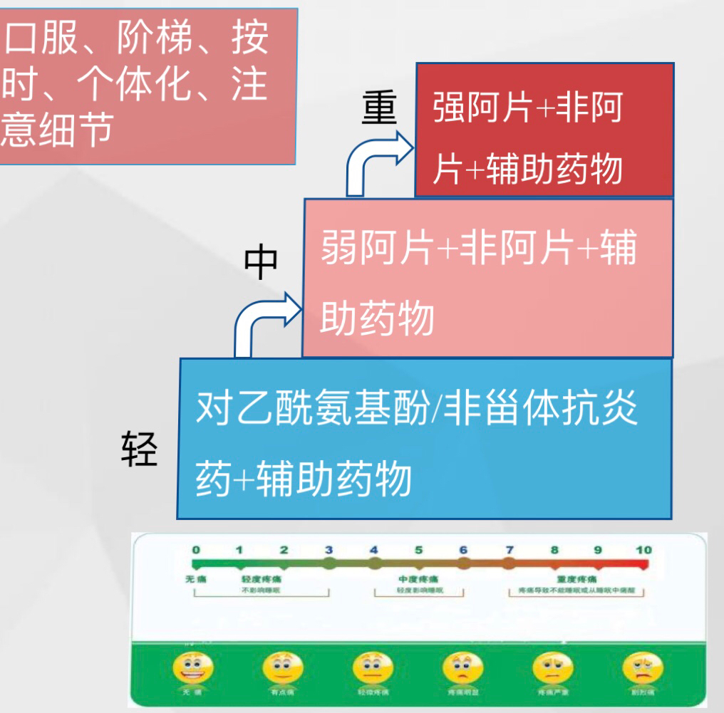 自上世纪80年代世界卫生组织发布癌痛的三阶梯治疗以来,相当部分的癌痛患者得到了有效的治疗,我们在癌痛的治疗中要注意5个基本原则:口服给药、按时给药、阶梯用药、个体化用药、注意具体细节。具体而言,癌痛患者首选口服药物治疗,同时口服过程中切不可疼痛时再行止痛治疗,应该遵循药物的代谢时程按时服用,而针对不同程度的疼痛从我们常用的消炎止痛药如对乙酰氨基酚、塞来昔布等一阶梯开始,再到曲马多等弱阿片类药物直至吗啡、芬太尼贴剂等强阿片类药物阶梯化治疗,根据疼痛病因和机制复合辅助类药物。在药物治疗过程中要动态评估止痛效果、不良反应等,及时调整药物用法用量。