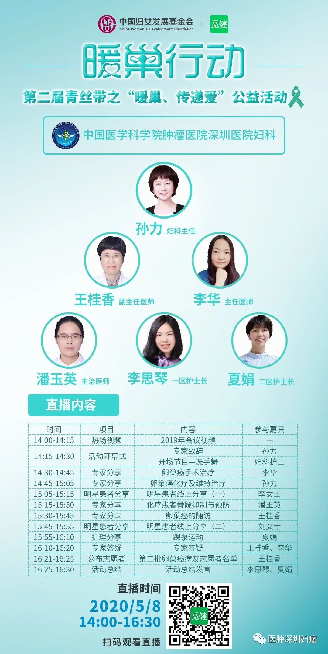 卵巢癌号称“妇癌之王”,是死亡率最高的妇科恶性肿瘤。我国每年新发卵巢癌5.2万,死亡人数高达3万,严重影响患者健康,卵巢癌反复复发带来的经济负担,也很可能引发一些家庭社会问题。为了给广大患者朋友普及肿瘤防治知识,树立正确的自我保健意识及科学规范的治疗理念,鼓励更多的朋友积极参与治疗与康复,提高生存周期和生存质量,更加坚定患者抗击肿瘤的信心,中国医学科学院肿瘤医院深圳医院妇科拟2020年5月8日举行第二期青丝带之"暖巢•传递爱”活动,活动内容围绕卵巢癌患者最关心的问题开展一系列的讲座、专家答疑解惑及明星患者在线交流分享。在此我们诚挚的邀请您,欢迎感兴趣的朋友们准时参加。